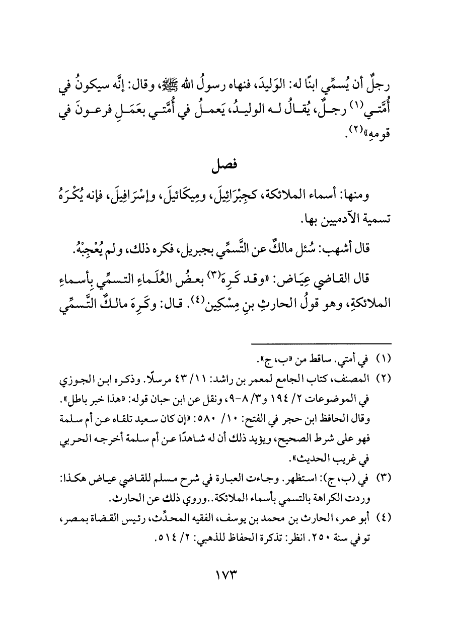 (¬٣) في (ب، ج): استظهر. وجاءت العبارة في شرح مسلم للقاضي عياض هكذا: وردت الكراهة بالتسمي بأسماء الملائكة .. وروي ذلك عن الحارث.