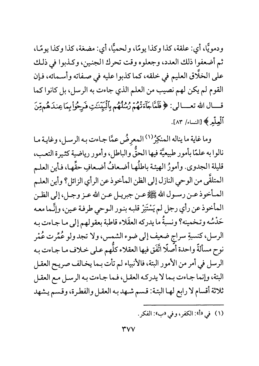 وما غاية ما يناله المنكِرُ (¬١) المعرِضُ عمَّا جاءت به الرسل، وغاية ما نالوا به علمًا بأمور طبيعيَّة فيها الحقُّ والباطل، وأمور رياضية كثيرة التعب، قليلة الجدوى. وأمورُ الهيئة باطلُها أضعافُ أضعافِ حقِّها، فأين العلم المتلقَّى من الوحي النازل إلى الظن المأخوذ عن الرأي الزائل؟ وأين العلم المأخوذ عن رسول الله - صلى الله عليه وسلم - عن جبريل عن الله عز وجل، إلى الظن المأخوذ عن رأي رجل لم يَسْتَنِرْ قلبه بنور الوحي طرفة عين، وإنَّما معه حَدْسُه وتخمينه؟ ونسبةُ ما يدركه العقَلاء قاطبة بعقولهم إلى ما جاءت به الرسل، كنسبةِ سراجٍ ضعيف إلى ضوء الشمس، ولا تجد ولو عُمِّرت عُمْر نوح مسألةً واحدة أصلًا اتَّفَق فيها العقلاء كلُّهم على خلاف ما جاءت به الرسل في أمر من الأمور البتة، فالأنبياء لم تأت بما يخالف صريح العقل البتة، وإنما جاءت بما لا يدركه العقل، فما جاءت به الرسل مع العقل ثلاثة أقسام لا رابع لها البتة: قسم شهد به العقل والفطرة، وقسم يشهد