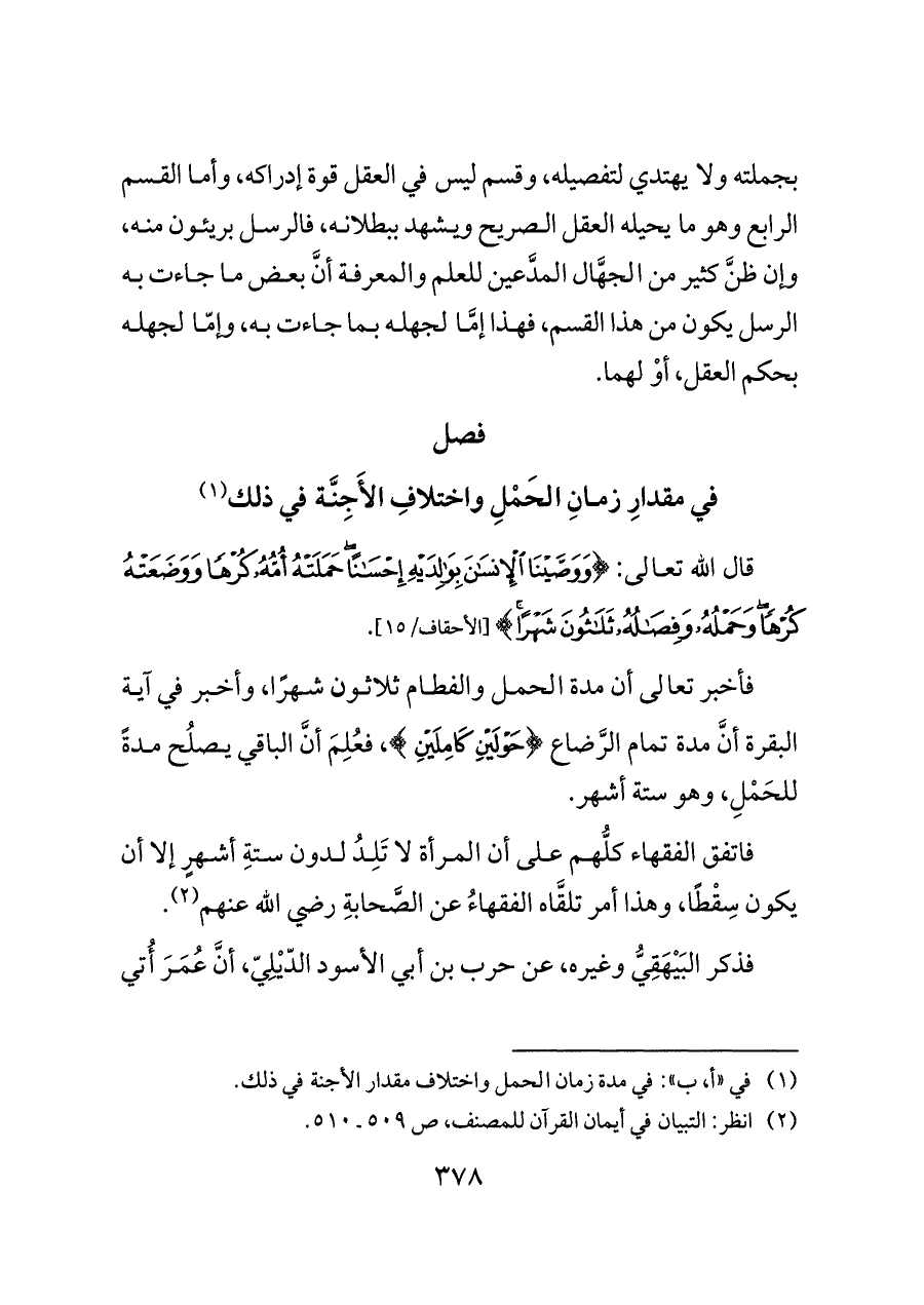 فأخبر تعالى أن مدة الحمل والفطام ثلاثون شهرًا، وأخبر في آية البقرة أنَّ مدة تمام الرَّضاع {حَوْلَيْنِ كَامِلَيْنِ}، فعُلِمَ أنَّ الباقي يصلُح مدةً للحَمْلِ، وهو ستة أشهر.