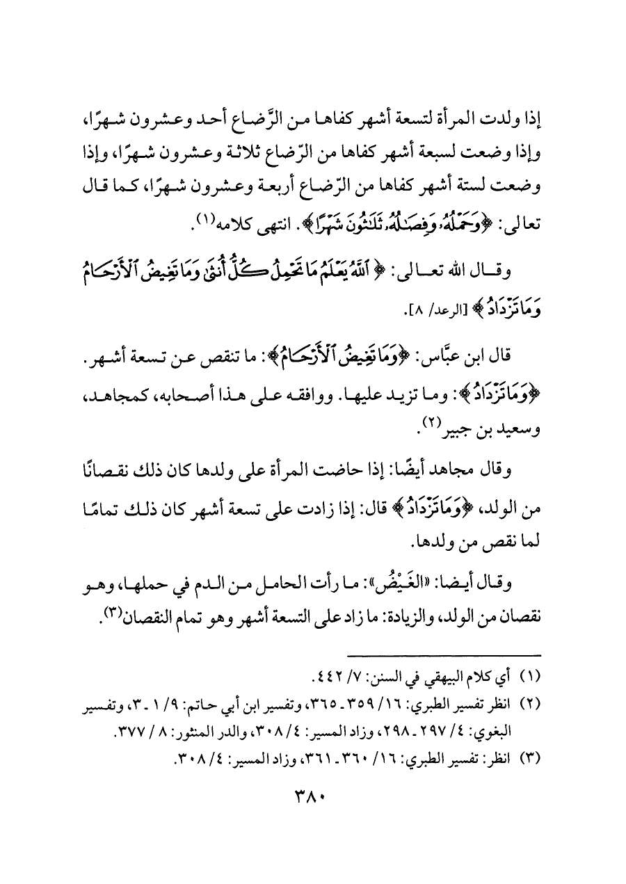 قال ابن عبَّاس: {وَمَا تَغِيضُ الْأَرْحَامُ}: ما تنقص عن تسعة أشهر. {وَمَا تَزْدَادُ}: وما تزيد عليها. ووافقه على هذا أصحابه، كمجاهد، وسعيد بن جبير (¬٢).