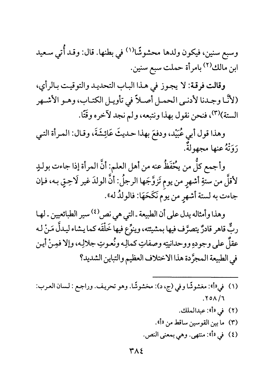 وقالت فرقة: لا يجوز في هذا الباب التحديد والتوقيت بالرأي، (لأنَّا وجدنا لأدنى الحمل أصلاً في تأويل الكتاب، وهو الأشهر الستة) (¬٣)، فنحن نقول بهذا ونتبعه، ولم نجد لآخره وقَتًا.