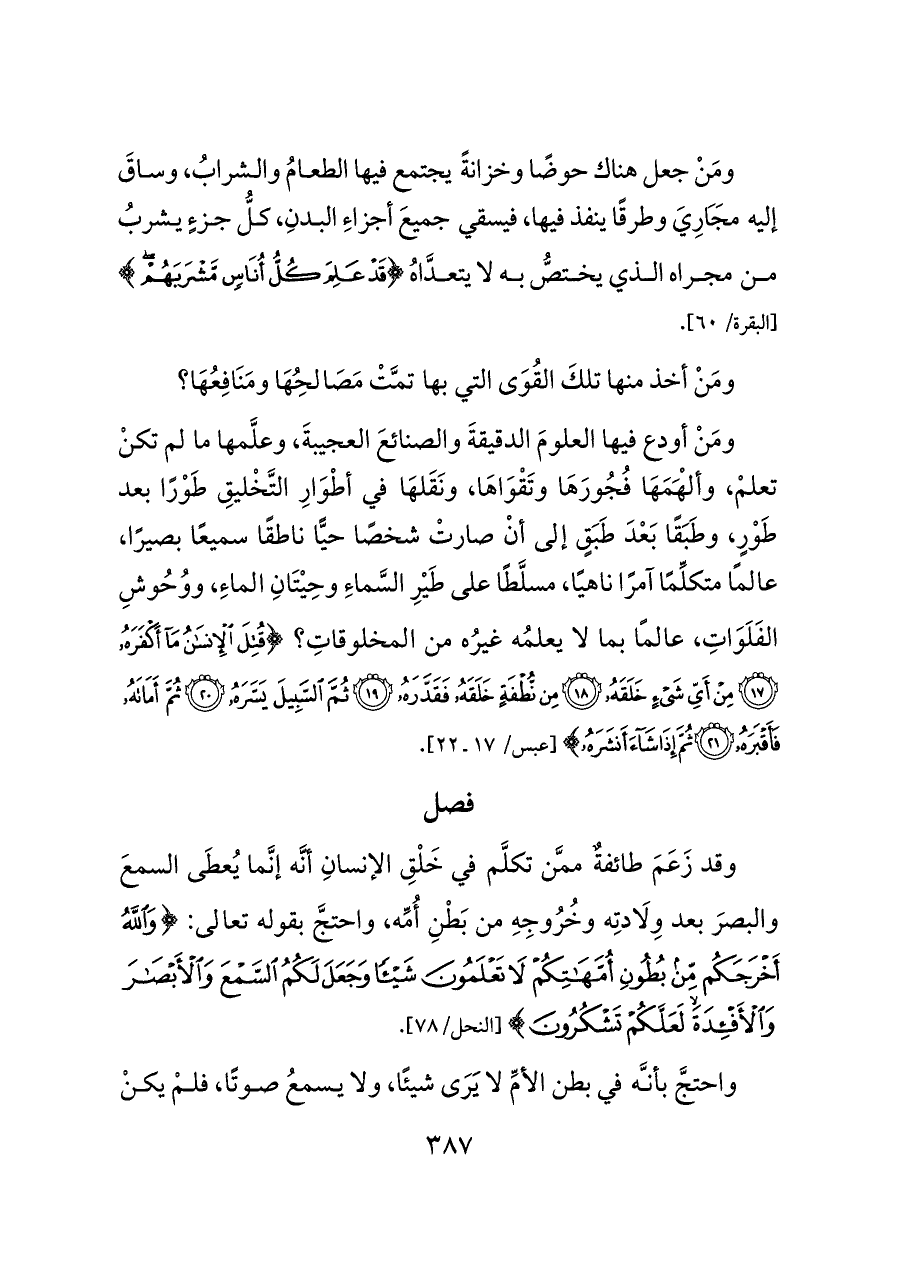 وقد زَعَمَ طائفةٌ ممَّن تكلَّم في خَلْقِ الإنسانِ أنَّه إنَّما يُعطَى السمعَ والبصرَ بعد وِلَادتِه وخُرُوجِهِ من بَطْنِ أُمِّه، واحتجَّ بقوله تعالى: {وَاللَّهُ أَخْرَجَكُمْ مِنْ بُطُونِ أُمَّهَاتِكُمْ لَا تَعْلَمُونَ شَيْئًا وَجَعَلَ لَكُمُ السَّمْعَ وَالْأَبْصَارَ وَالْأَفْئِدَةَ لَعَلَّكُمْ تَشْكُرُونَ} [النحل/٧٨].