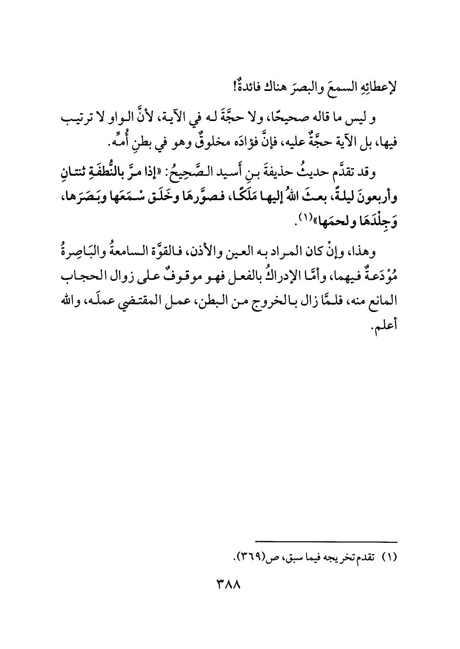و ليس ما قاله صحيحًا، ولا حجَّةَ له في الآية، لأنَّ الواو لا ترتيب فيها، بل الآية حجَّةٌ عليه، فإنَّ فؤادَه مخلوقٌ وهو في بطنِ أُمِّه.