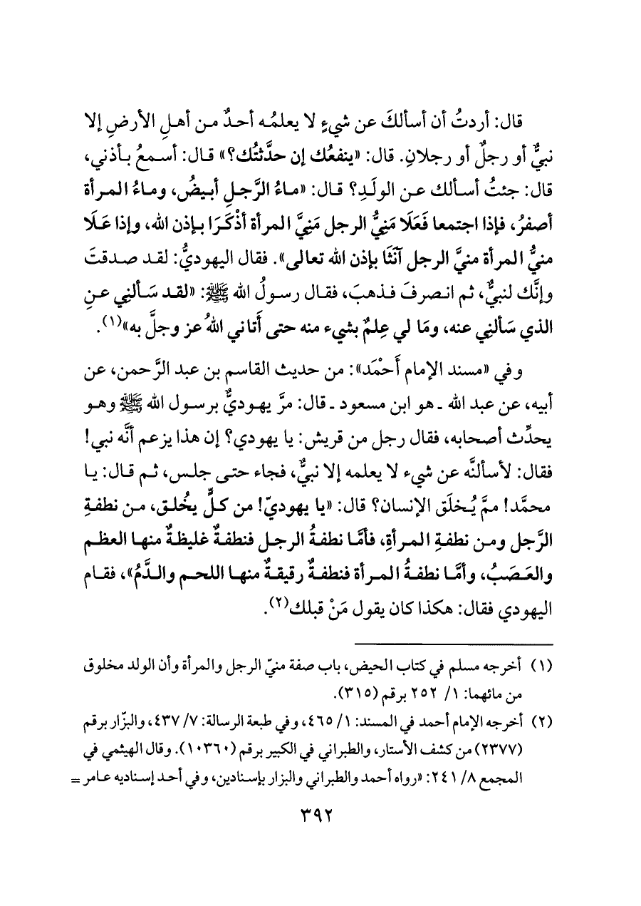 وفي «مسند الإمام أَحْمَد»: من حديث القاسم بن عبد الرَّحمن، عن أبيه، عن عبد الله ـ هو ابن مسعود ـ قال: مرَّ يهوديٌّ برسول الله - صلى الله عليه وسلم - وهو يحدِّث أصحابه، فقال رجل من قريش: يا يهودي؟ إن هذا يزعم أنَّه نبي! فقال: لأسألنَّه عن شيء لا يعلمه إلا نبيٌّ، فجاء حتى جلس، ثم قال: يا محمَّد! ممَّ يُخلَق الإنسان؟ قال: «يا يهوديّ! من كلٍّ يُخلق، من نطفةِ الرَّجل ومن نطفةِ المرأةِ، فأمَّا نطفةُ الرجل فنطفةٌ غليظةٌ منها العظم والعَصَبُ، وأمَّا نطفةُ المرأة فنطفةٌ رقيقةٌ منها اللحم والدَّمُ»، فقام اليهودي فقال: هكذا كان يقول مَنْ قبلك (¬٢).