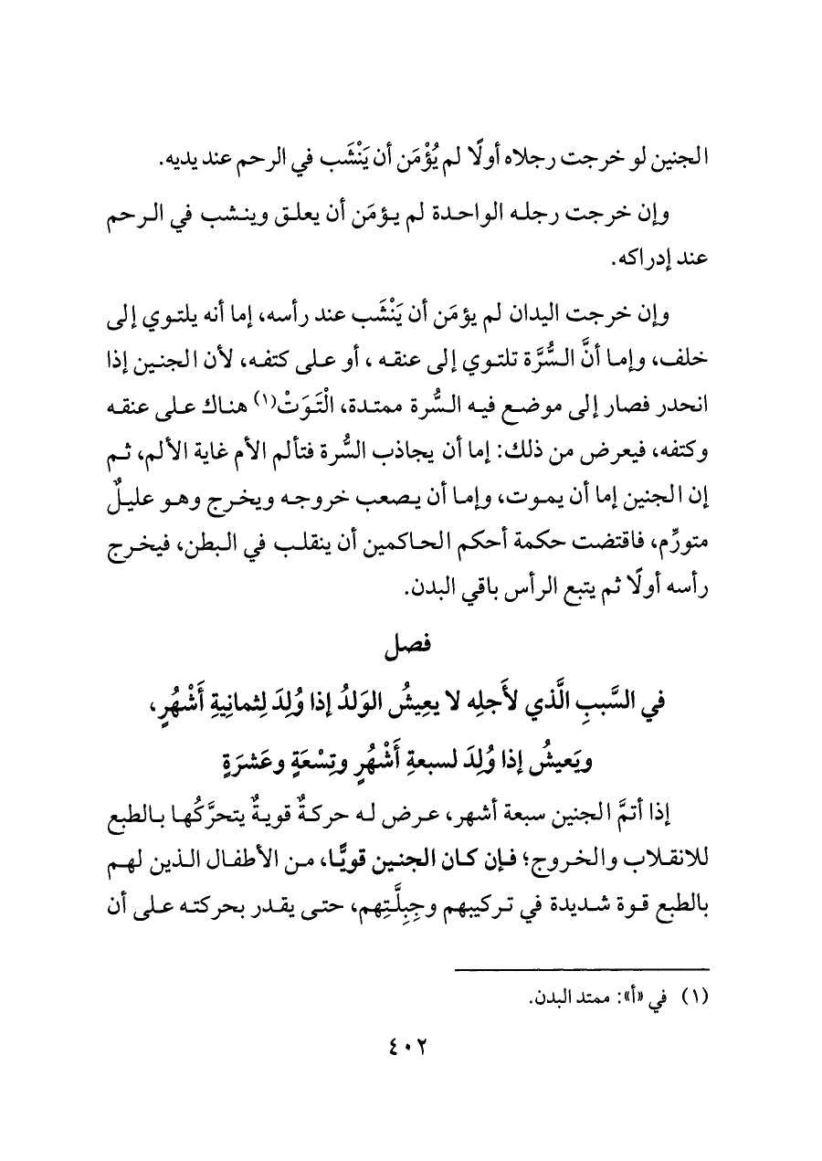 وإن خرجت اليدان لم يؤمَن أن يَنْشَب عند رأسه، إما أنه يلتوي إلى خلف، وإما أنَّ السُّرَّة تلتوي إلى عنقه، أو على كتفه، لأن الجنين إذا انحدر فصار إلى موضع فيه السُّرة ممتدة، الْتَوَتْ (¬١) هناك على عنقه وكتفه، فيعرض من ذلك: إما أن يجاذب السُّرة فتألم الأم غاية الألم، ثم إن الجنين إما أن يموت، وإما أن يصعب خروجه ويخرج وهو عليلٌ متورِّم، فاقتضت حكمة أحكم الحاكمين أن ينقلب في البطن، فيخرج رأسه أولًا ثم يتبع الرأس باقي البدن.