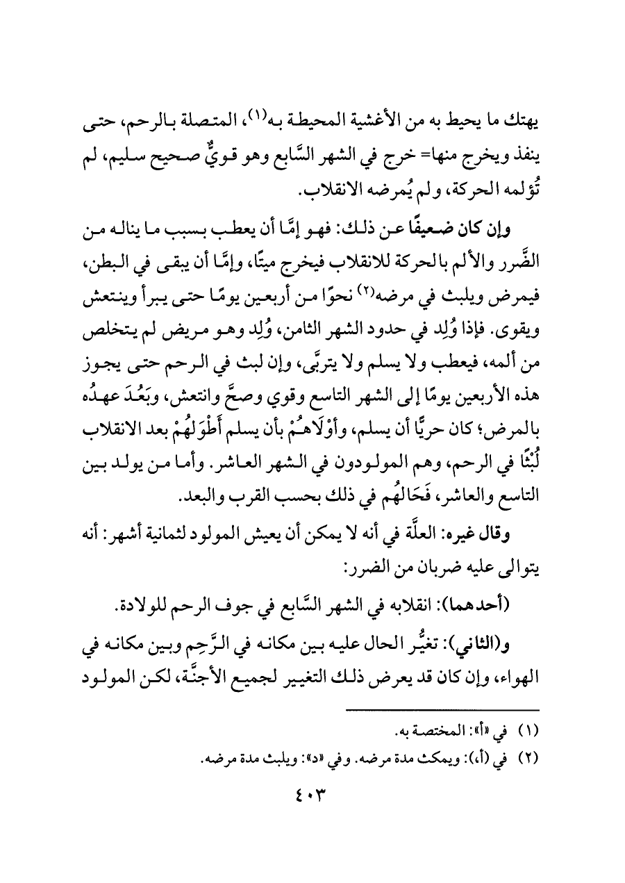 وإن كان ضعيفًا عن ذلك: فهو إمَّا أن يعطب بسبب ما يناله من الضَّرر والألم بالحركة للانقلاب فيخرج ميتًا، وإمَّا أن يبقى في البطن، فيمرض ويلبث في مرضه (¬٢) نحوًا من أربعين يومًا حتى يبرأ وينتعش ويقوى. فإذا وُلِد في حدود الشهر الثامن، وُلِد وهو مريض لم يتخلص من ألمه، فيعطب ولا يسلم ولا يتربَّى، وإن لبث في الرحم حتى يجوز هذه الأربعين يومًا إلى الشهر التاسع وقوي وصحَّ وانتعش، وبَعُدَ عهدُه بالمرض؛ كان حريًّا أن يسلم، وأوْلَاهُمْ بأن يسلم أَطْوَلُهمْ بعد الانقلاب لُبْثًا في الرحم، وهم المولودون في الشهر العاشر. وأما من يولد بين التاسع والعاشر، فَحَالُهم في ذلك بحسب القرب والبعد.