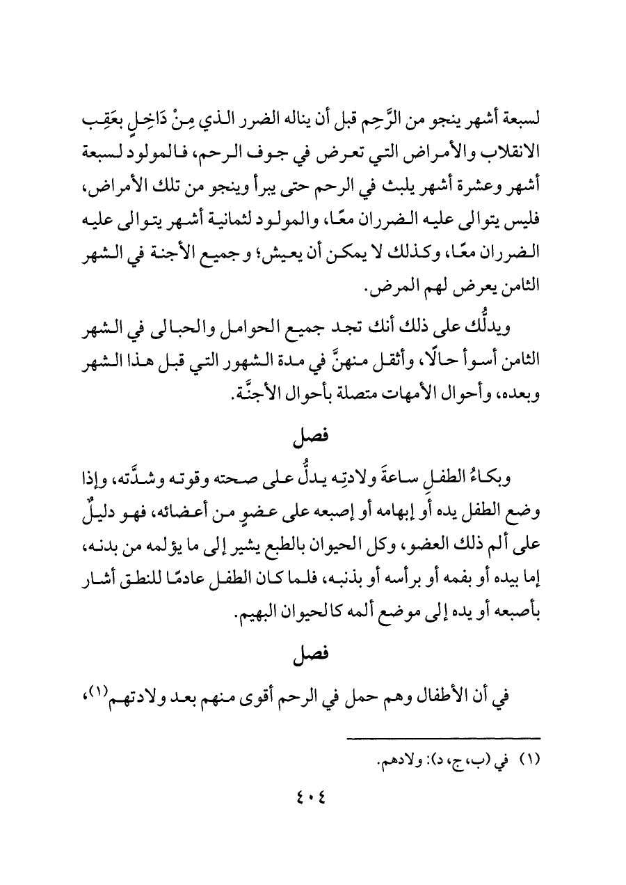 وبكاءُ الطفلِ ساعةَ ولادتِه يدلُّ على صحته وقوته وشدَّته، وإذا وضع الطفل يده أو إبهامه أو إصبعه على عضوٍ من أعضائه، فهو دليلٌ على ألم ذلك العضو، وكل الحيوان بالطبع يشير إلى ما يؤلمه من بدنه، إما بيده أو بفمه أو برأسه أو بذنبه، فلما كان الطفل عادمًا للنطق أشار بأصبعه أو يده إلى موضع ألمه كالحيوان البهيم.