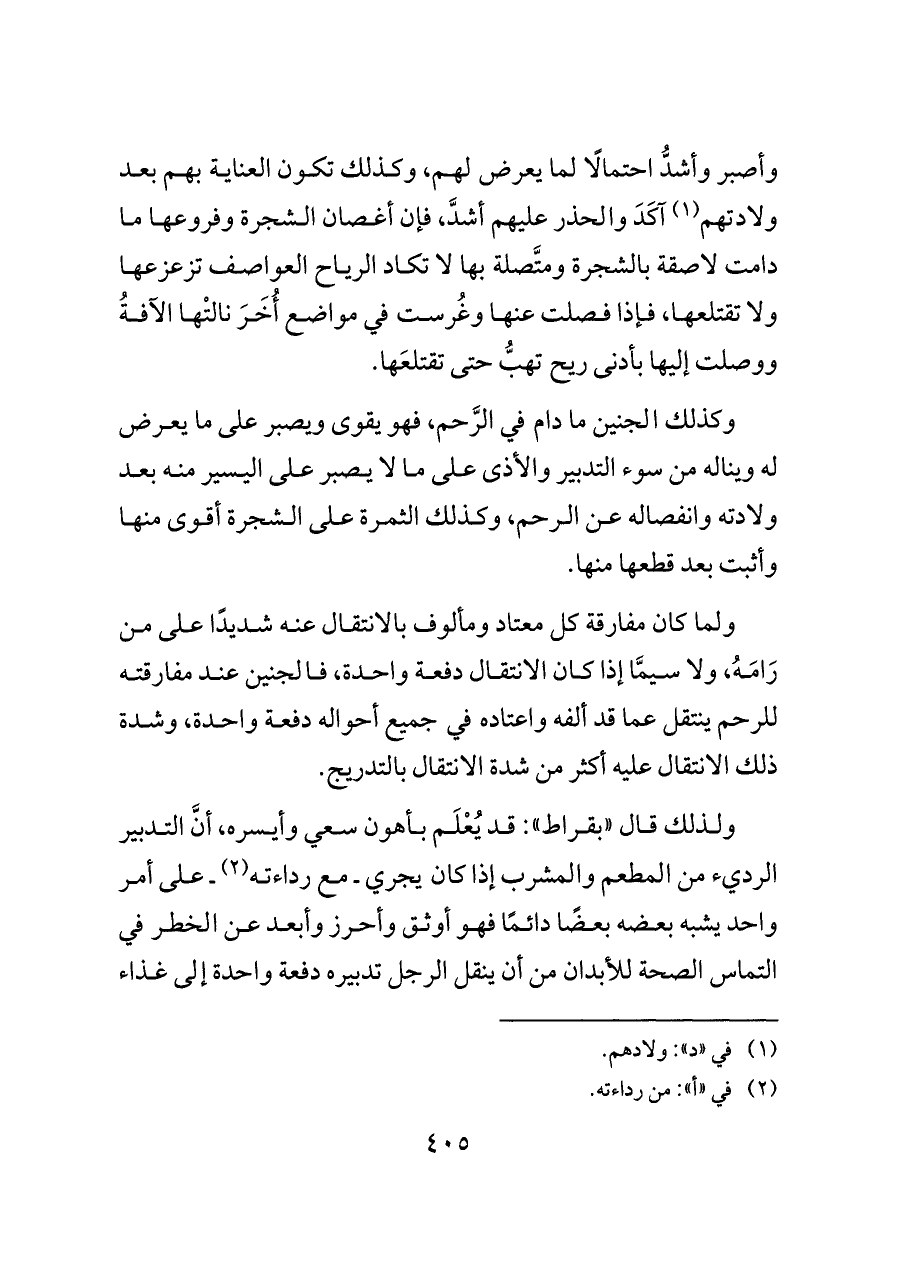 وأصبر وأشدُّ احتمالًا لما يعرض لهم، وكذلك تكون العناية بهم بعد ولادتهم (¬١) آكَدَ والحذر عليهم أشدَّ، فإن أغصان الشجرة وفروعها ما دامت لاصقة بالشجرة ومتَّصلة بها لا تكاد الرياح العواصف تزعزعها ولا تقتلعها، فإذا فصلت عنها وغُرست في مواضع أُخَرَ نالتْها الآفةُ ووصلت إليها بأدنى ريح تهبُّ حتى تقتلعَها.