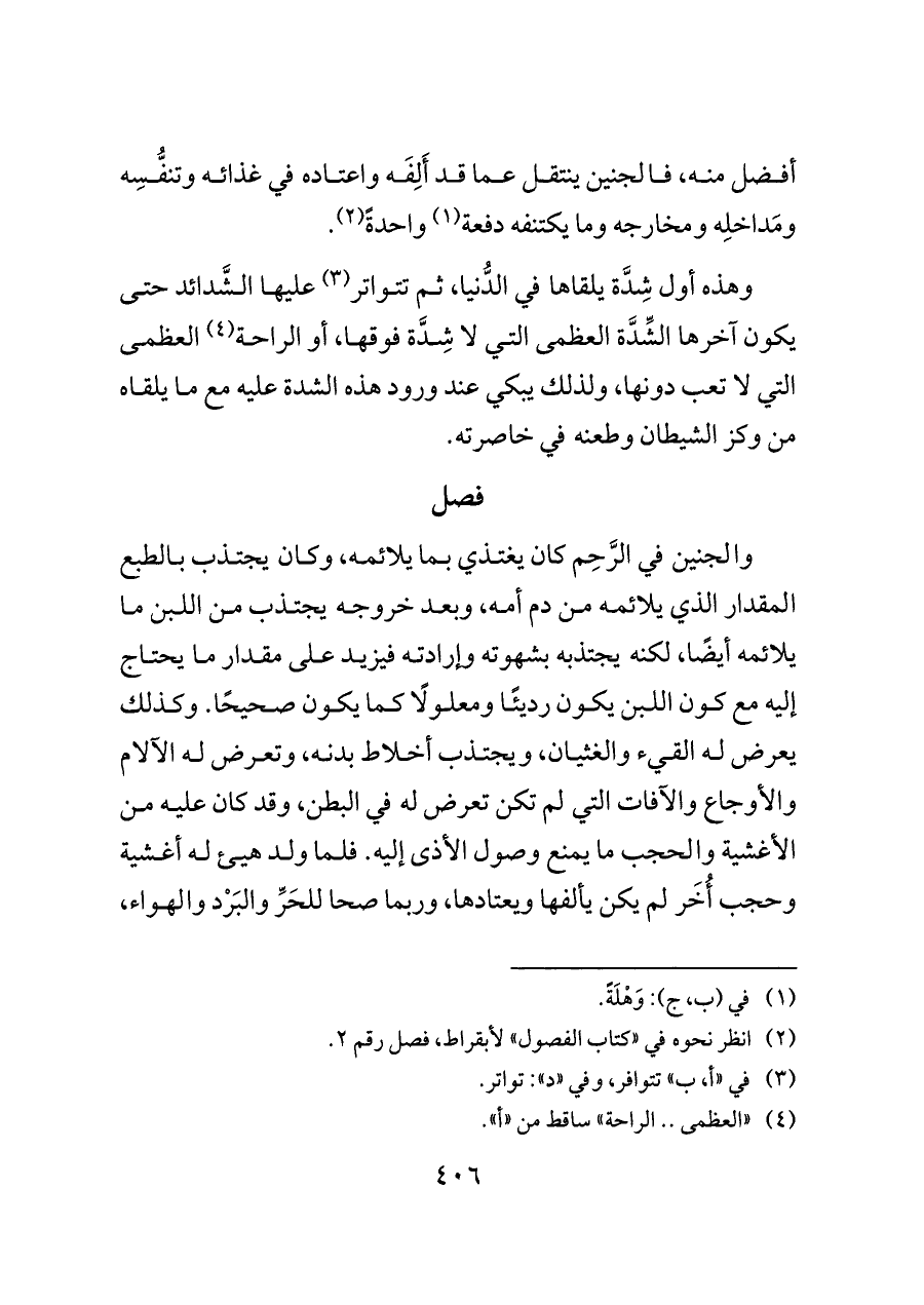 والجنين في الرَّحِم كان يغتذي بما يلائمه، وكان يجتذب بالطبع المقدار الذي يلائمه من دم أمه، وبعد خروجه يجتذب من اللبن ما يلائمه أيضًا، لكنه يجتذبه بشهوته وإرادته فيزيد على مقدار ما يحتاج إليه مع كون اللبن يكون رديئًا ومعلولًا كما يكون صحيحًا. وكذلك يعرض له القيء والغثيان، ويجتذب أخلاط بدنه، وتعرض له الآلام والأوجاع والآفات التي لم تكن تعرض له في البطن، وقد كان عليه من الأغشية والحجب ما يمنع وصول الأذى إليه. فلما ولد هيئ له أغشية وحجب أُخَر لم يكن يألفها ويعتادها، وربما صحا للحَرِّ والبَرْد والهواء،