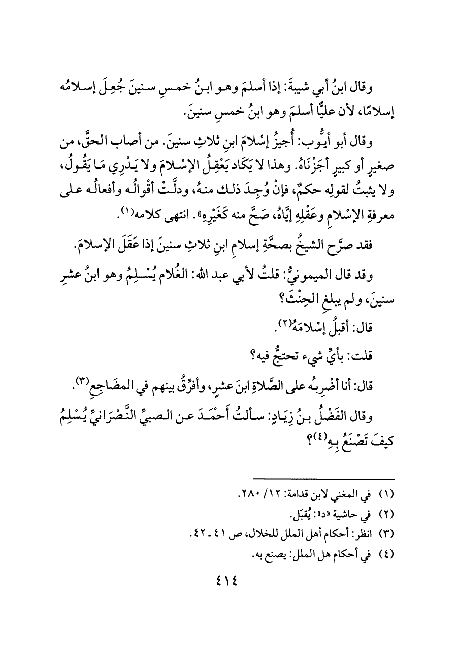 وقد قال الميمونيُّ: قلتُ لأبي عبد الله: الغُلام يُسْلِمُ وهو ابنُ عشرِ سنينَ، ولم يبلغِ الحِنْثَ؟