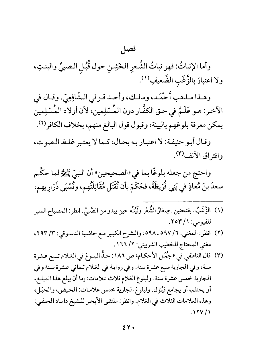 وهذا مذهب أَحْمَد، ومالك، وأحد قولي الشّافِعِيّ. وقال في الآخر: هو عَلَمٌ في حق الكفَّار دون المُسْلِمين، لأن أولاد المُسْلِمين يمكن معرفة بلوغهم بالبينة، وقبول قول البالغ منهم، بخلاف الكافر (¬٢).