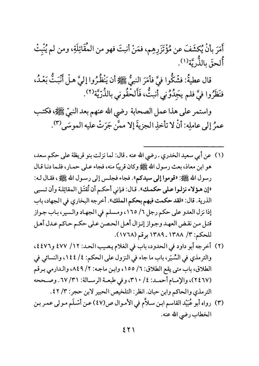 (¬١) عن أبي سعيد الخدري ـ رضي الله عنه ـ قال: لما نزلت بنو قريظة على حكم سعد، هو ابن معاذ، بعث رسول الله - صلى الله عليه وسلم - وكان قريبًا منه، فجاء على حمار، فلما دنا قال رسول الله - صلى الله عليه وسلم -: «قوموا إلى سيدكم». فجاء فجلس إلى رسول الله - صلى الله عليه وسلم -، فقال له: «إن هؤلاء نزلوا على حكمك». قال: فإني أحكم أن تُقتَل المقاتِلة وأن تسبى الذرية. قال: «لقد حكمت فيهم بحكم الملك». أخرجه البخاري في الجهاد، باب إذا نزل العدو على حكم رجل ٦/ ١٦٥، ومسلم في الجهاد والسير، باب جواز قتل من نقض العهد وجواز إنزال أهل الحصن على حكم حاكم عدل أهل للحكم: ٣/ ١٣٨٨ ـ ١٣٨٩ برقم (١٧٦٨).