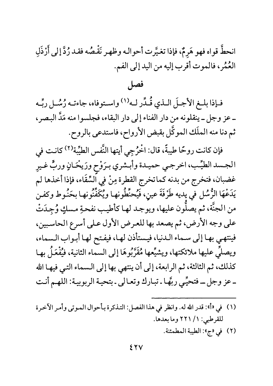 (¬١) في «أ»: قدر الله له. وانظر في هذا الفصل: التذكرة بأحوال الموتى وأمر الآخرة للقرطبي: ١/ ٢٢١ وما بعدها.
