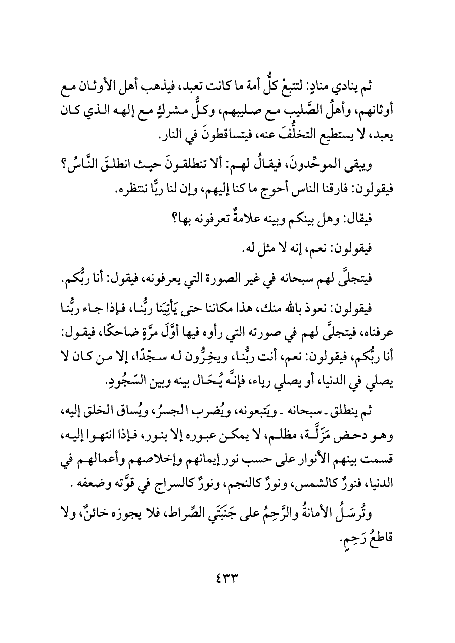 ثم ينطلق ـ سبحانه ـ ويَتبعونه، ويُضرب الجسرُ، ويُساق الخلق إليه، وهو دحض مَزَلَّة، مظلم، لا يمكن عبوره إلا بنور، فإذا انتهوا إليه، قسمت بينهم الأنوار على حسب نور إيمانهم وإخلاصهم وأعمالهم في الدنيا، فنورٌ كالشمس، ونورٌ كالنجم، ونورٌ كالسراج في قوَّته وضعفه.