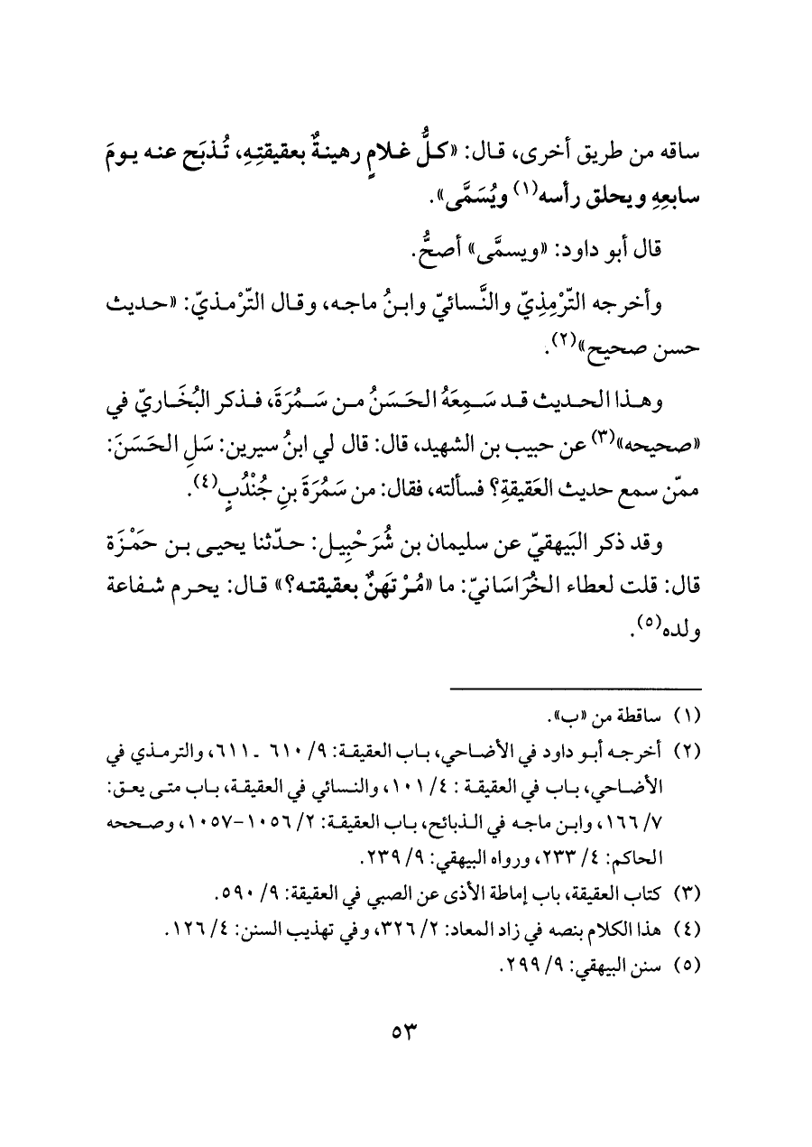 وهذا الحديث قد سَمِعَهُ الحَسَنُ من سَمُرَةَ، فذكر البُخَاريّ في "صحيحه" (¬٣) عن حبيب بن الشهيد، قال: قال لي ابنُ سيرين: سَلِ الحَسَنَ: ممّن سمع حديث العَقيقةِ؟ فسألته، فقال: من سَمُرَةَ بنِ جُنْدُبٍ (¬٤).