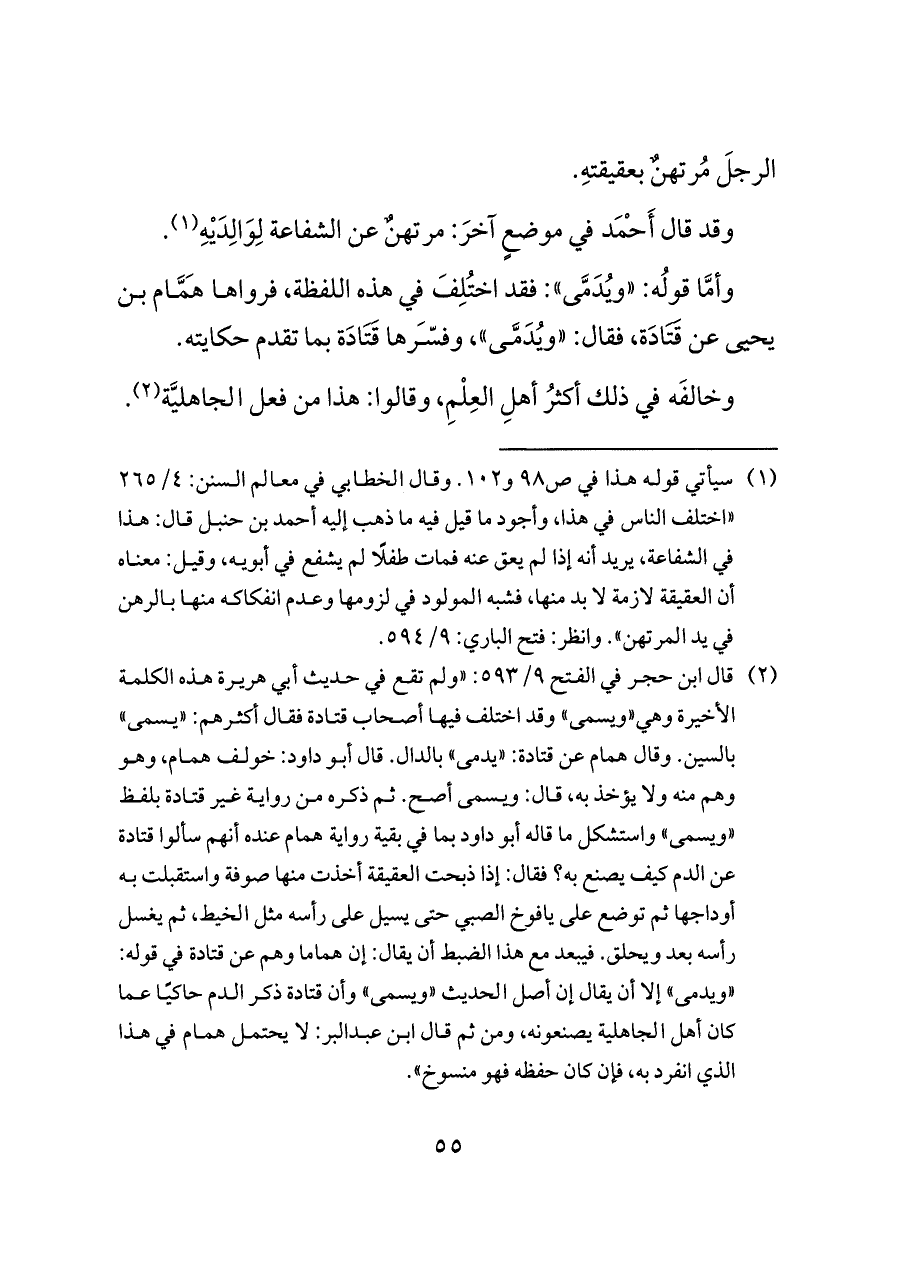 (¬١) سيأتي قوله هذا في ص ٩٨ و ١٠٢. وقال الخطابي في معالم السنن: ٤/ ٢٦٥ "اختلف الناس في هذا، وأجود ما قيل فيه ما ذهب إليه أحمد بن حنبل قال: هذا في الشفاعة، يريد أنه إذا لم يعق عنه فمات طفلًا لم يشفع في أبويه، وقيل: معناه أن العقيقة لازمة لا بد منها، فشبه المولود في لزومها وعدم انفكاكه منها بالرهن في يد المرتهن". وانظر: فتح الباري: ٩/ ٥٩٤.