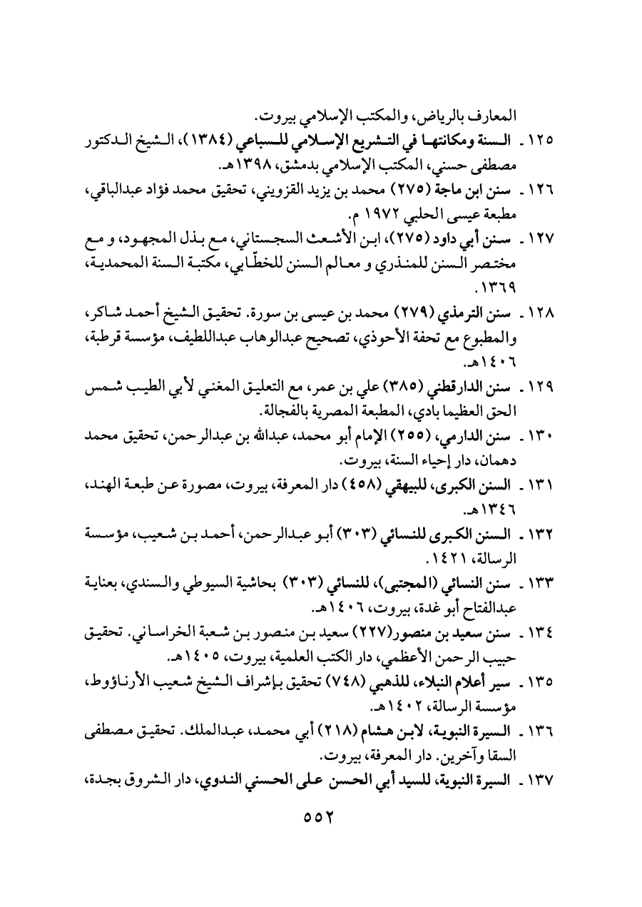 ١٢٦ - سنن ابن ماجة (٢٧٥) محمد بن يزيد القزويني، تحقيق محمد فؤاد عبدالباقي، مطبعة عيسى الحلبي ١٩٧٢ م.