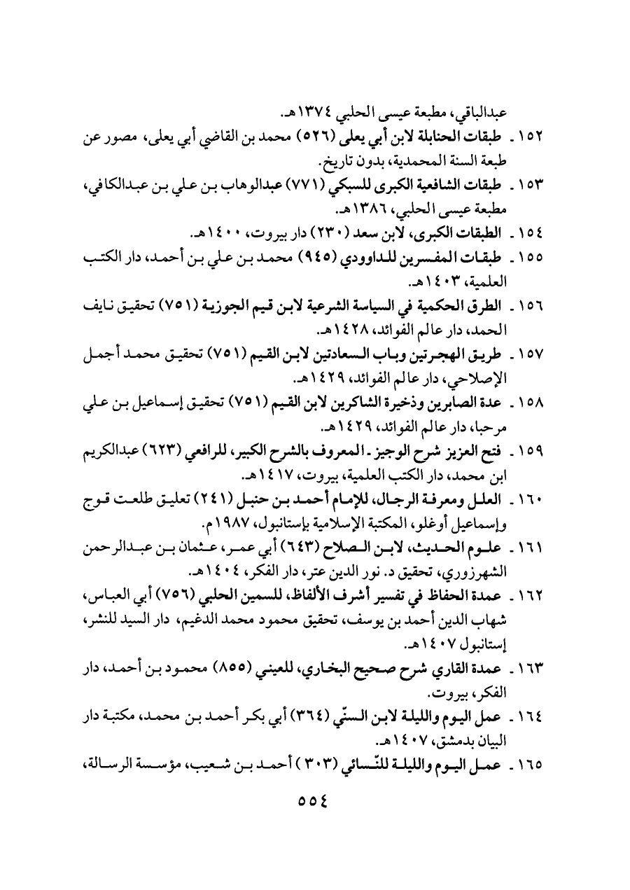 ١٦٠ - العلل ومعرفة الرجال، للإمام أحمد بن حنبل (٢٤١) تعليق طلعت قوج وإسماعيل أوغلو، المكتبة الإسلامية بإستانبول، ١٩٨٧ م.