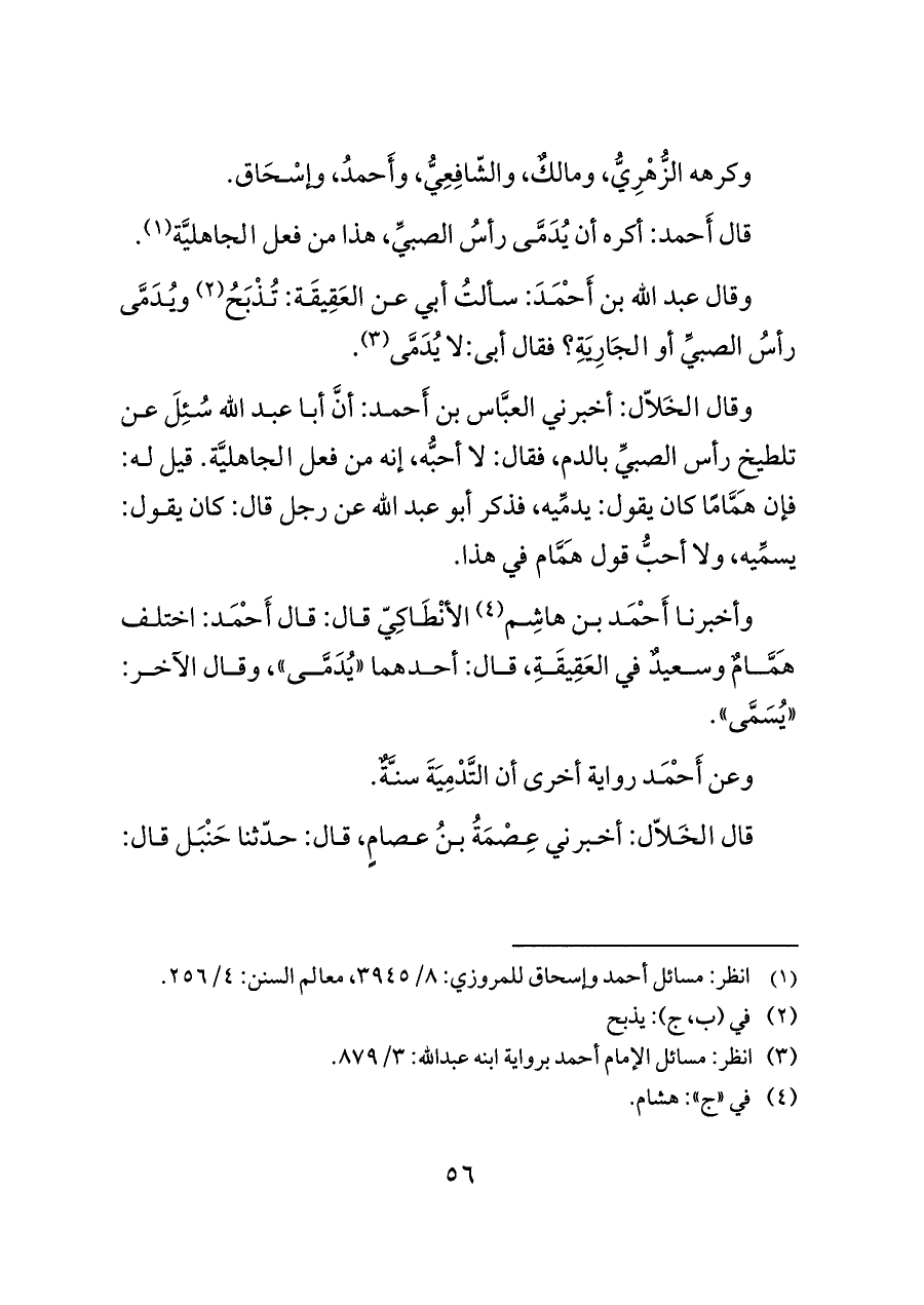 وقال الخَلاّل: أخبرني العبَّاس بن أَحمد: أنَّ أبا عبد الله سُئِلَ عن تلطيخ رأس الصبيِّ بالدم، فقال: لا أحبُّه، إنه من فعل الجاهليَّة. قيل له: فإن هَمَّامًا كان يقول: يدمِّيه، فذكر أبو عبد الله عن رجل قال: كان يقول: يسمِّيه، ولا أحبُّ قول هَمَّام في هذا.