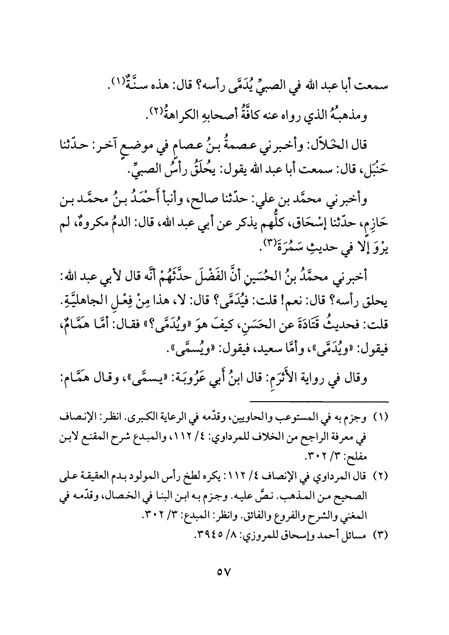 أخبرني محمَّدُ بنُ الحُسَينِ أنَّ الفَضْلَ حدَّثَهُمْ أنَّه قال لأبي عبد الله: يحلق رأسه؟ قال: نعم! قلت: فيُدَمَّى؟ قال: لا، هذا مِنْ فِعْلِ الجاهليَّةِ. قلت: فحديثُ قَتَادَةَ عن الحَسَنِ، كيفَ هوَ "ويُدَمَّى؟ " فقال: أمَّا هَمَّامٌ، فيقول: "ويُدَمَّى"، وأمَّا سعيد، فيقول: "ويُسمَّى".