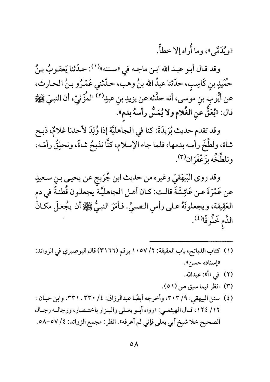 وقد قال أبو عبد الله ابن ماجه في "سننه" (¬١): حدّثنا يَعقوبُ بنُ حُمَيدٍ بنِ كَاسِبٍ، حدّثنا عبدُ الله بنُ وهب، حدّثني عَمْرُو بنُ الحارث، عن أيُّوبِ بنِ موسى، أنه حدَّثه عن يزيدِ بنِ عبدٍ (¬٢) المُزَنِيّ، أن النبيّ - صلى الله عليه وسلم - قال: "يُعَقُّ عنِ الغُلام ولا يُمَسُّ رأسهُ بدمٍ".