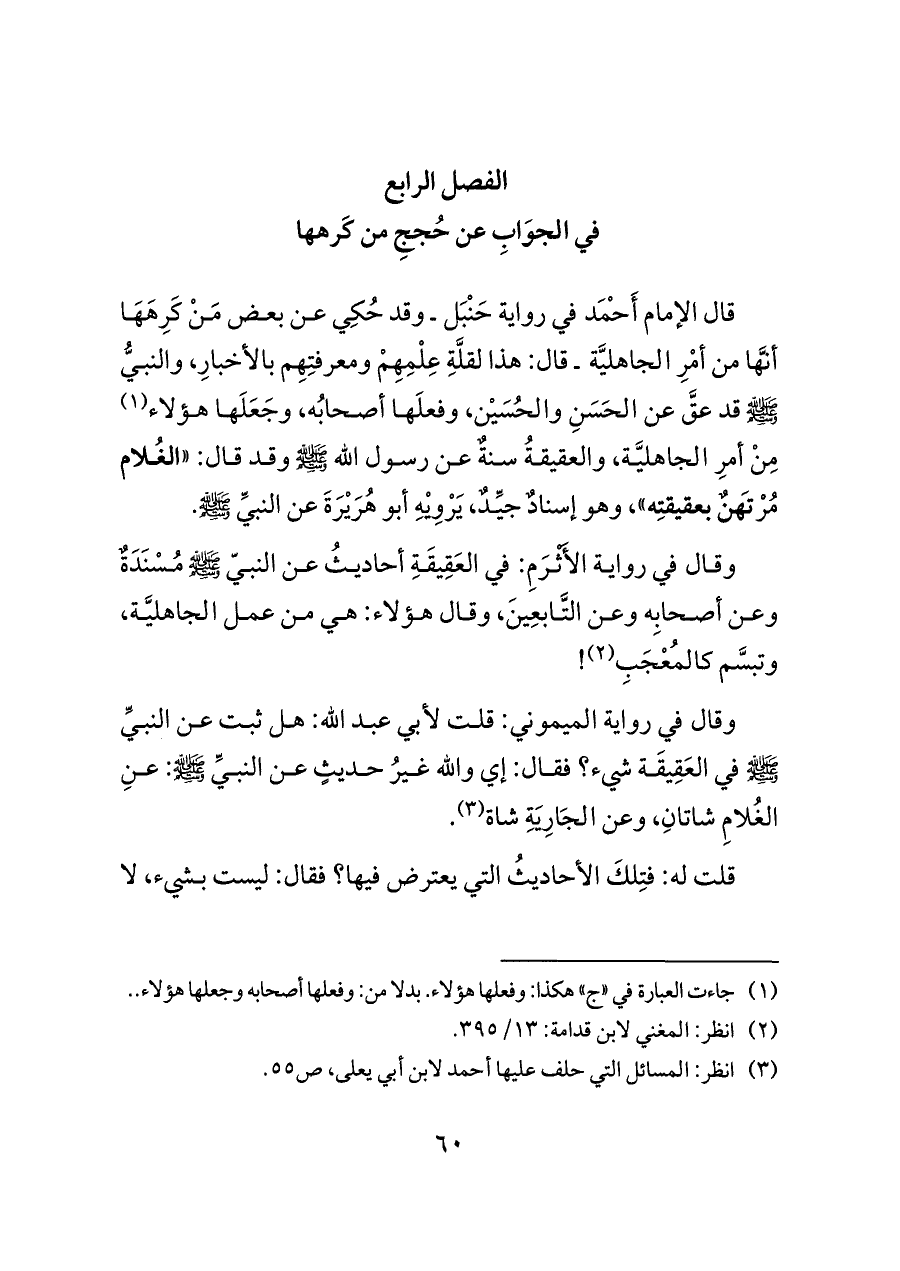 قال الإمام أَحْمَد في رواية حَنْبَل ـ وقد حُكِي عن بعض مَنْ كَرِهَهَا أنَّها من أمْرِ الجاهليَّة ـ قال: هذا لقلَّةِ عِلْمِهِمْ ومعرفتِهِم بالأخبارِ، والنبيُّ - صلى الله عليه وسلم - قد عقَّ عن الحَسَنِ والحُسَيْن، وفعلَها أصحابُه، وجَعَلَها هؤلاء (¬١) مِنْ أمرِ الجاهليَّة، والعقيقةُ سنةٌ عن رسول الله - صلى الله عليه وسلم - وقد قال: "الغُلام مُرْتَهنٌ بعقيقتِه"، وهو إسنادٌ جيِّدٌ، يَرْوِيْهِ أبو هُرَيْرَةَ عن النبيِّ - صلى الله عليه وسلم -.