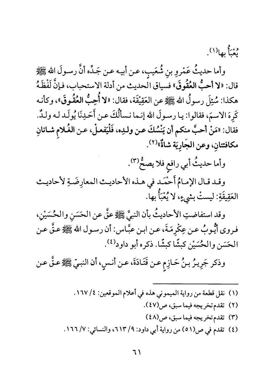 وأما حديثُ عَمْروِ بنِ شُعَيبٍ، عن أبيه عن جَدِّه أنَّ رسولَ الله - صلى الله عليه وسلم - قال: "لا أحبُّ العُقُوقَ" فسياق الحديث من أدلة الاستحباب، فإنَّ لَفْظَهُ هكذا: سُئِلَ رسولُ الله - صلى الله عليه وسلم - عن العَقِيْقَة، فقال: "لا أُحِبُّ العُقُوقَ"، وكأنه كَرِهَ الاسمَ، فقالوا: يا رسولَ الله إنما نسألُكَ عن أَحَدِنَا يُولَد له ولدٌ. فقال: "مَنْ أحبَّ منكم أن يَنْسُكَ عن ولدِه، فَلْيَفعلْ، عن الغُلامِ شاتانِ مكافئتانِ، وعن الجَارِيَة شاةٌ" (¬٢).