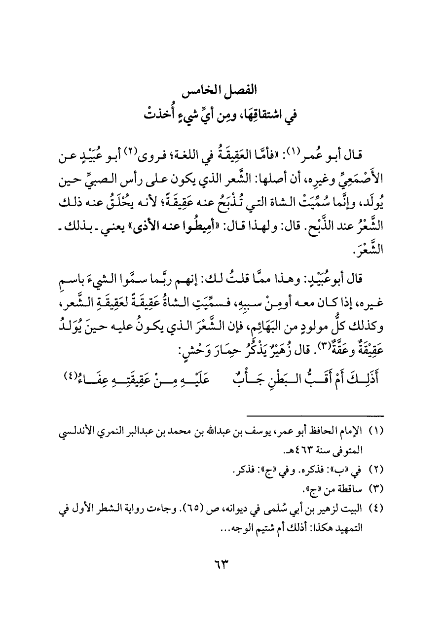 قال أبوعُبَيْدٍ: وهذا ممَّا قلتُ لك: إنهم ربَّما سمَّوا الشيءَ باسمِ غيره، إذا كان معه أومِنْ سببِهِ، فسمِّيَتِ الشاةُ عَقِيقَةً لعَقِيقَةِ الشَّعر، وكذلك كلُّ مولودٍ من البَهَائِمِ، فإن الشَّعْرَ الذي يكونُ عليه حينَ يُوَلدُ عَقِيْقَةٌ وعَقَّةٌ (¬٣). قال زُهَيْرٌ يَذْكُرُ حِمَارَ وَحْشٍ: