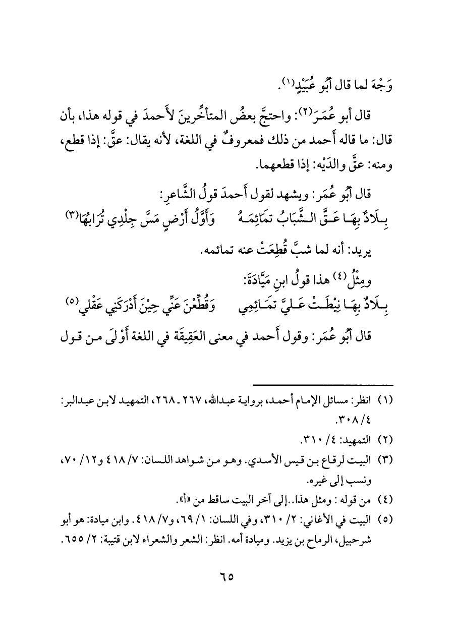 قال أبو عُمَرَ (¬٢): واحتجَّ بعضُ المتأخِّرينَ لأَحمدَ في قوله هذا، بأن قال: ما قاله أَحمد من ذلك فمعروفٌ في اللغة، لأنه يقال: عقَّ: إذا قطع، ومنه: عقَّ والدَيْه: إذا قطعهما.