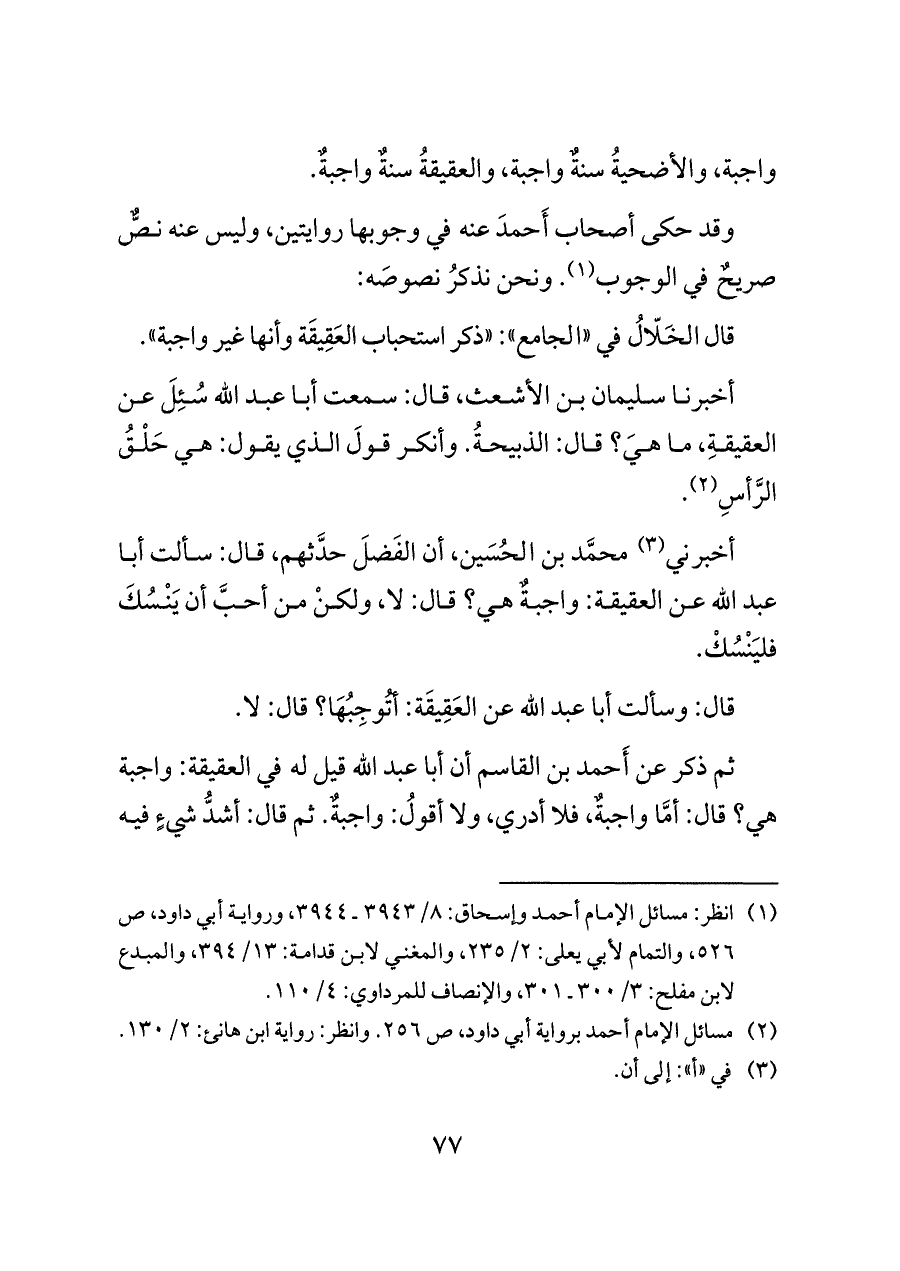 ثم ذكر عن أَحمد بن القاسم أن أبا عبد الله قيل له في العقيقة: واجبة هي؟ قال: أمَّا واجبةٌ، فلا أدري، ولا أقولُ: واجبةٌ. ثم قال: أشدُّ شيءٍ فيه