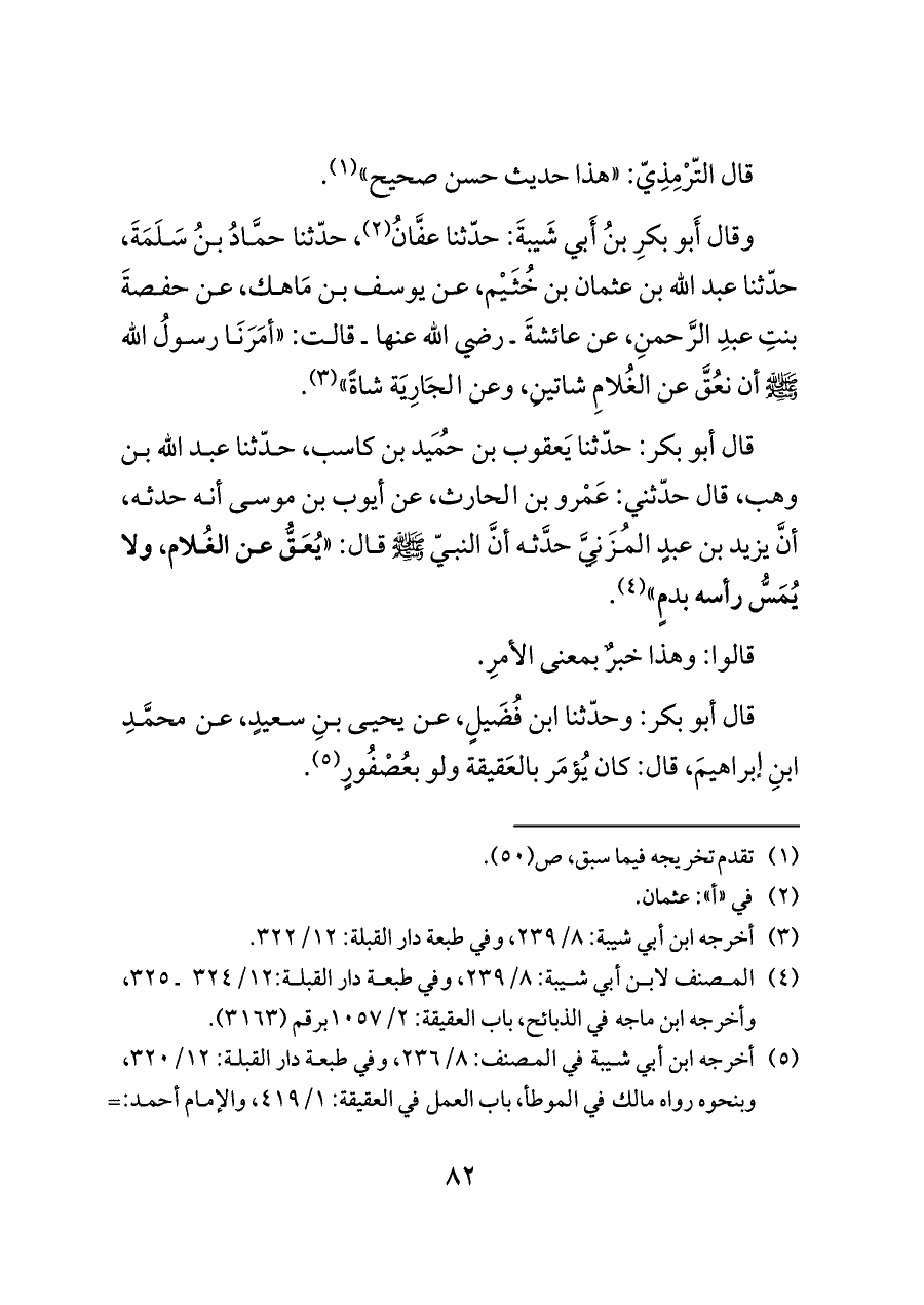 وقال أَبو بكرِ بنُ أَبي شَيبةَ: حدّثنا عفَّانُ (¬٢)، حدّثنا حمَّادُ بنُ سَلَمَةَ، حدّثنا عبد الله بن عثمان بن خُثَيْم، عن يوسف بن مَاهك، عن حفصةَ بنتِ عبدِ الرَّحمنِ، عن عائشةَ ـ رضي الله عنها ـ قالت: "أمَرَنَا رسولُ الله - صلى الله عليه وسلم - أن نعُقَّ عن الغُلامِ شاتينِ، وعن الجَارِيَة شاةً" (¬٣).