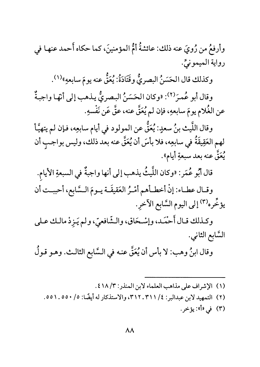 قال أبُو عُمَر: "وكان اللَّيثُ يذهب إلى أنها واجبةٌ في السبعةِ الأيامِ.
