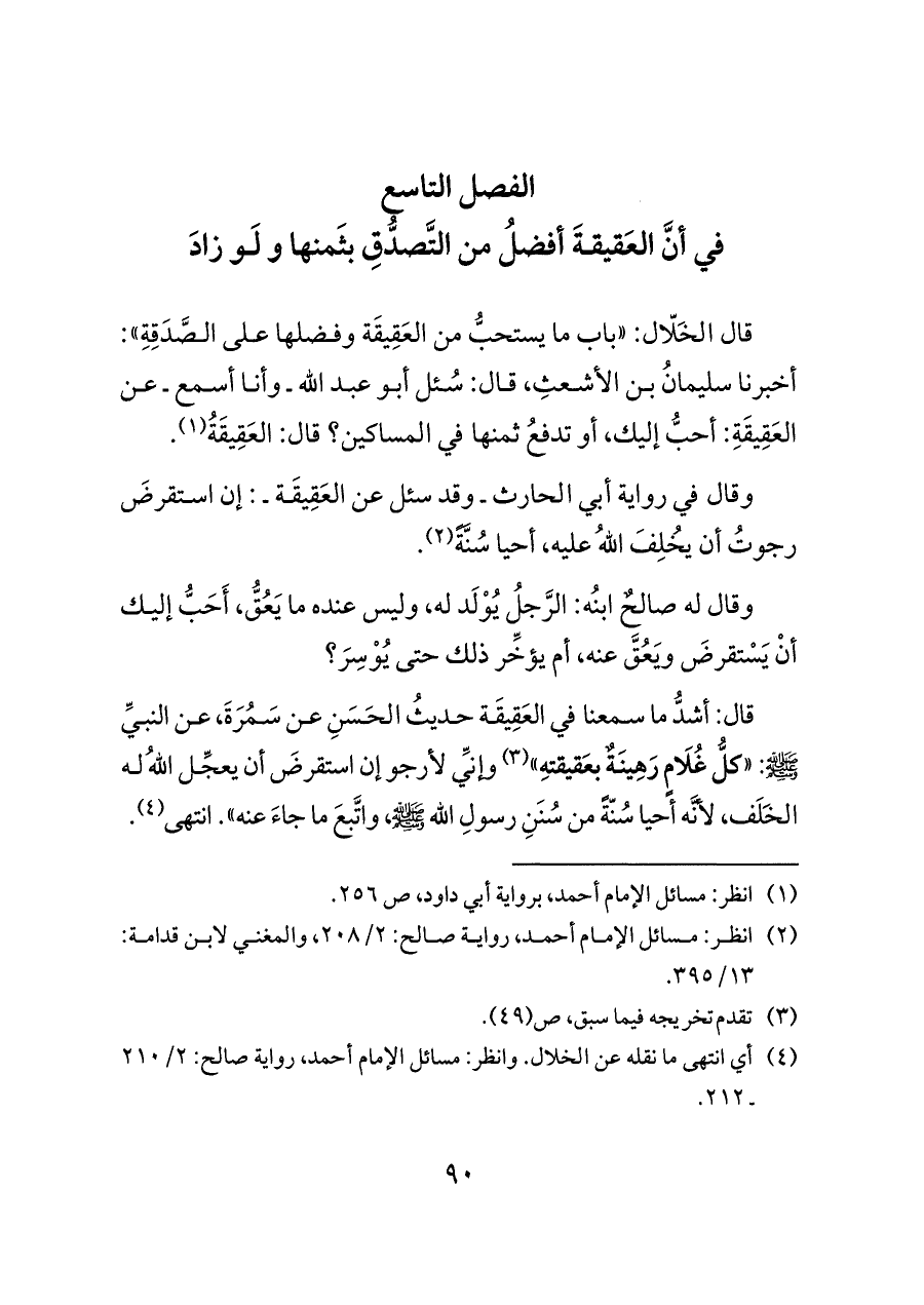 قال الخَلّال: "باب ما يستحبُّ من العَقِيقَة وفضلها على الصَّدَقِةِ": أخبرنا سليمانُ بن الأشعثِ، قال: سُئل أبو عبد الله ـ وأنا أسمع ـ عن العَقِيقَةِ: أحبُّ إليك، أو تدفعُ ثمنها في المساكين؟ قال: العَقِيقَةُ (¬١).