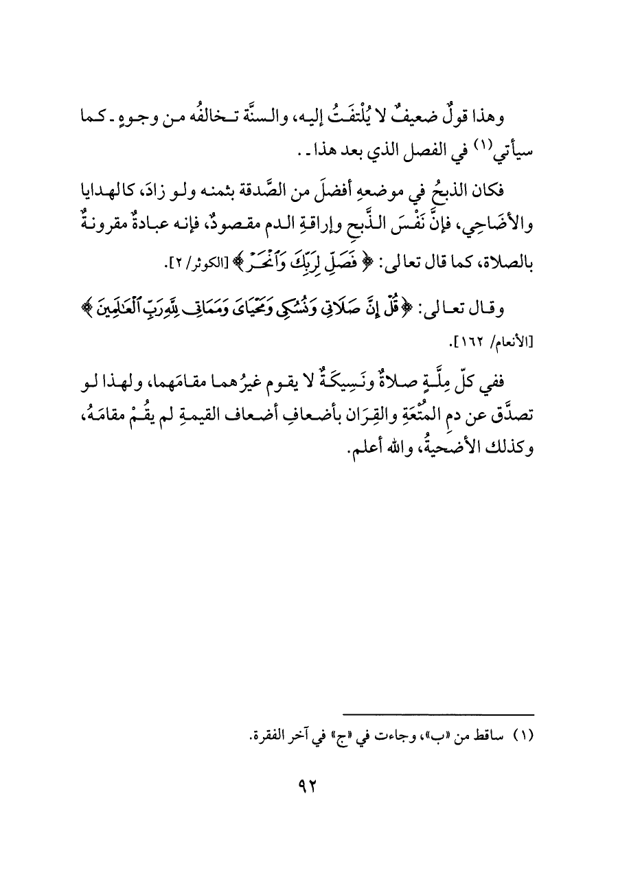 فكان الذبحُ في موضعهِ أفضلَ من الصَّدقة بثمنه ولو زادَ، كالهدايا والأضَاحِي، فإنَّ نَفْسَ الذَّبحِ وإراقةِ الدم مقصودٌ، فإنه عبادةٌ مقرونةٌ بالصلاة، كما قال تعالى: {فَصَلِّ لِرَبِّكَ وَانْحَرْ} [الكوثر/٢].