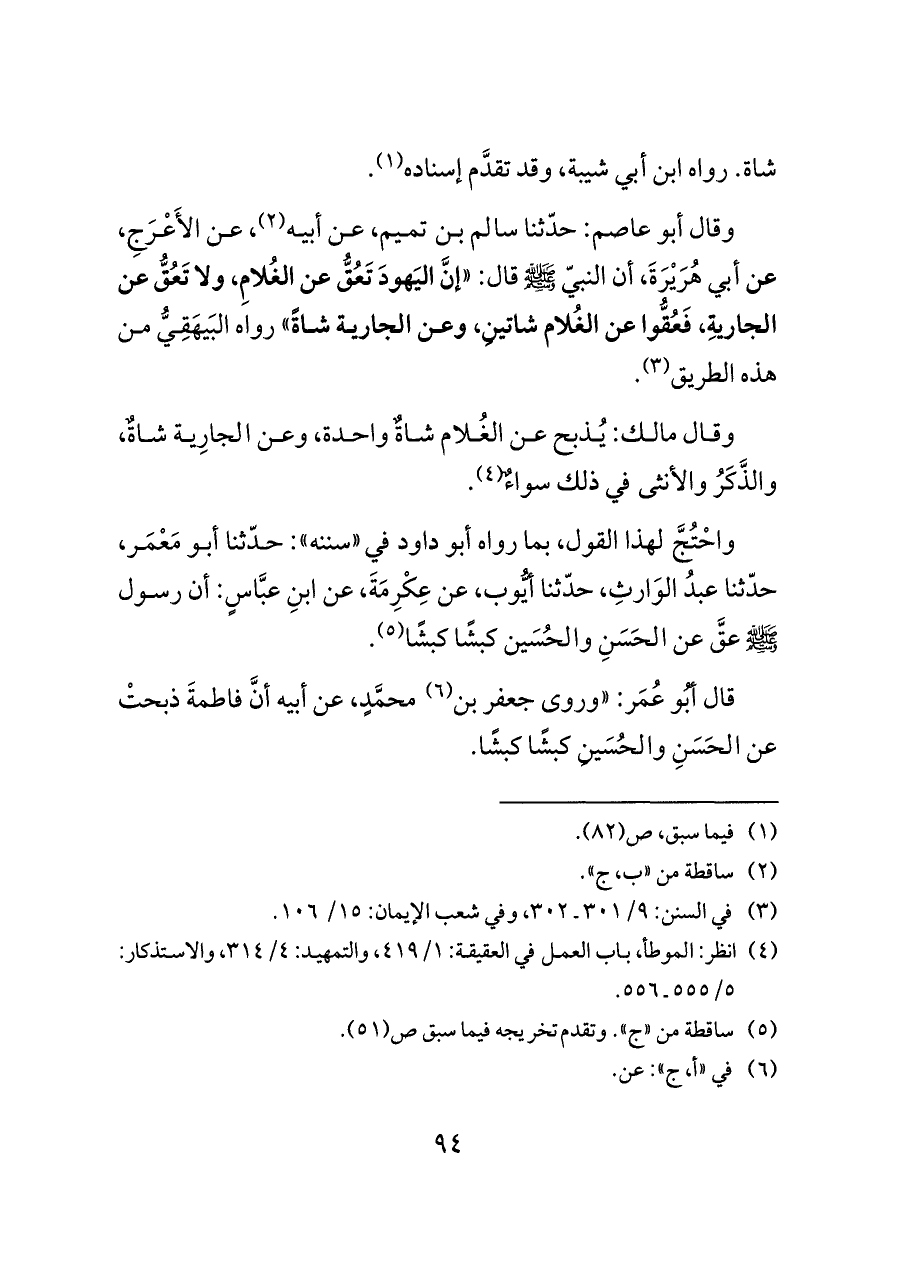(¬٤) انظر: الموطأ، باب العمل في العقيقة: ١/ ٤١٩، والتمهيد: ٤/ ٣١٤، والاستذكار: ٥/ ٥٥٥ ـ ٥٥٦.
