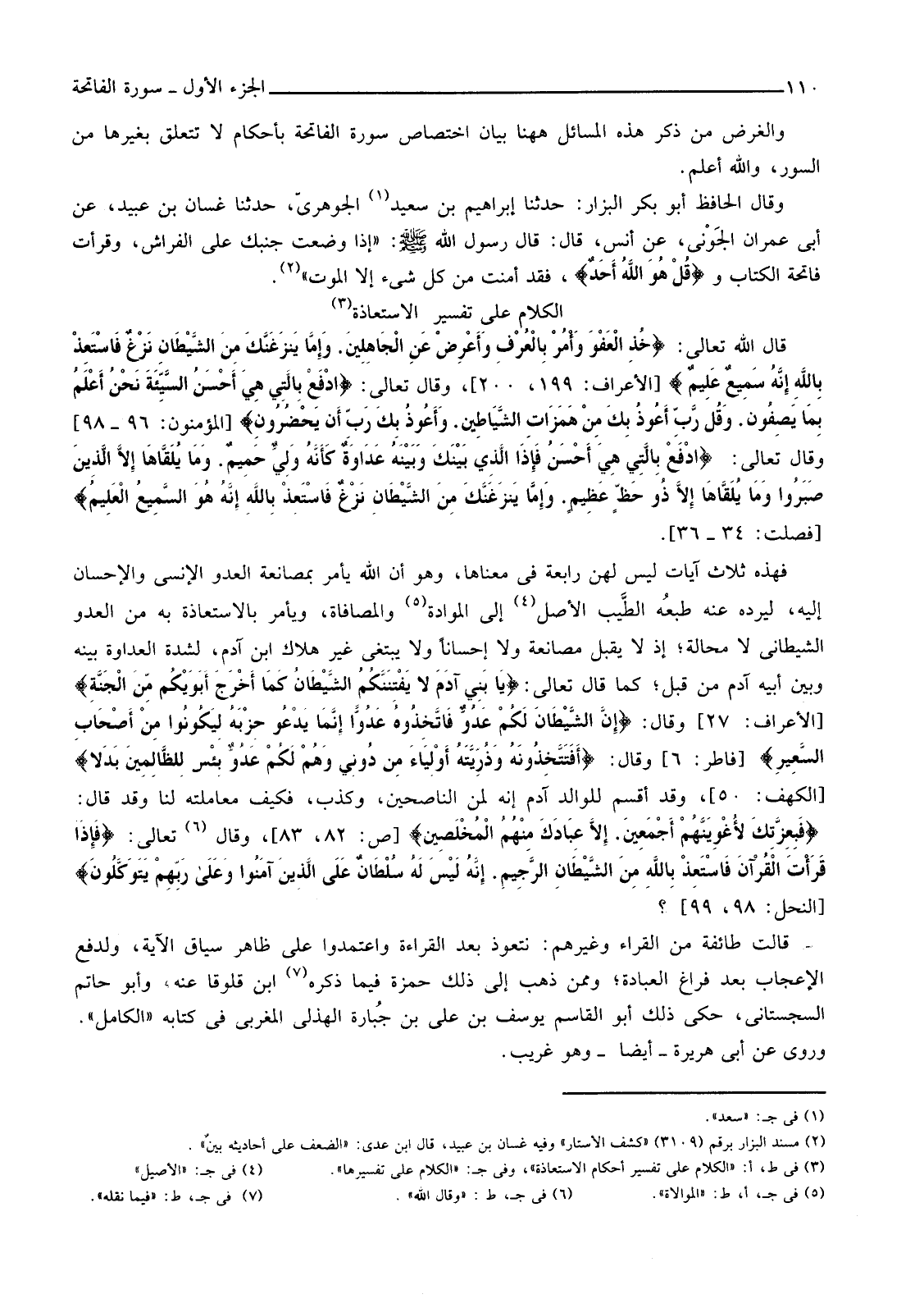 الْكَلَامُ عَلَى تَفْسِيرِ الِاسْتِعَاذَةِ (¬3) قَالَ اللَّهُ تَعَالَى: {خُذِ الْعَفْوَ وَأْمُرْ بِالْعُرْفِ وَأَعْرِضْ عَنِ الْجَاهِلِينَ * وَإِمَّا يَنزغَنَّكَ مِنَ الشَّيْطَانِ نزغٌ فَاسْتَعِذْ بِاللَّهِ إِنَّهُ سَمِيعٌ عَلِيمٌ} [الْأَعْرَافِ: 199، 200] ، وَقَالَ تَعَالَى: {ادْفَعْ بِالَّتِي هِيَ أَحْسَنُ السَّيِّئَةَ نَحْنُ أَعْلَمُ بِمَا يَصِفُونَ * وَقُلْ رَبِّ أَعُوذُ بِكَ مِنْ هَمَزَاتِ الشَّيَاطِينِ * وَأَعُوذُ بِكَ رَبِّ أَنْ يَحْضُرُونِ} [الْمُؤْمِنُونَ: 96 -98] وَقَالَ تَعَالَى: {ادْفَعْ بِالَّتِي هِيَ أَحْسَنُ فَإِذَا الَّذِي بَيْنَكَ وَبَيْنَهُ عَدَاوَةٌ كَأَنَّهُ وَلِيٌّ حَمِيمٌ * وَمَا يُلَقَّاهَا إِلا الَّذِينَ صَبَرُوا وَمَا يُلَقَّاهَا إِلا ذُو حَظٍّ عَظِيمٍ * وَإِمَّا يَنزغَنَّكَ مِنَ الشَّيْطَانِ نزغٌ فَاسْتَعِذْ بِاللَّهِ إِنَّهُ هُوَ السَّمِيعُ الْعَلِيمُ} [فُصِّلَتْ: 34 -36] .