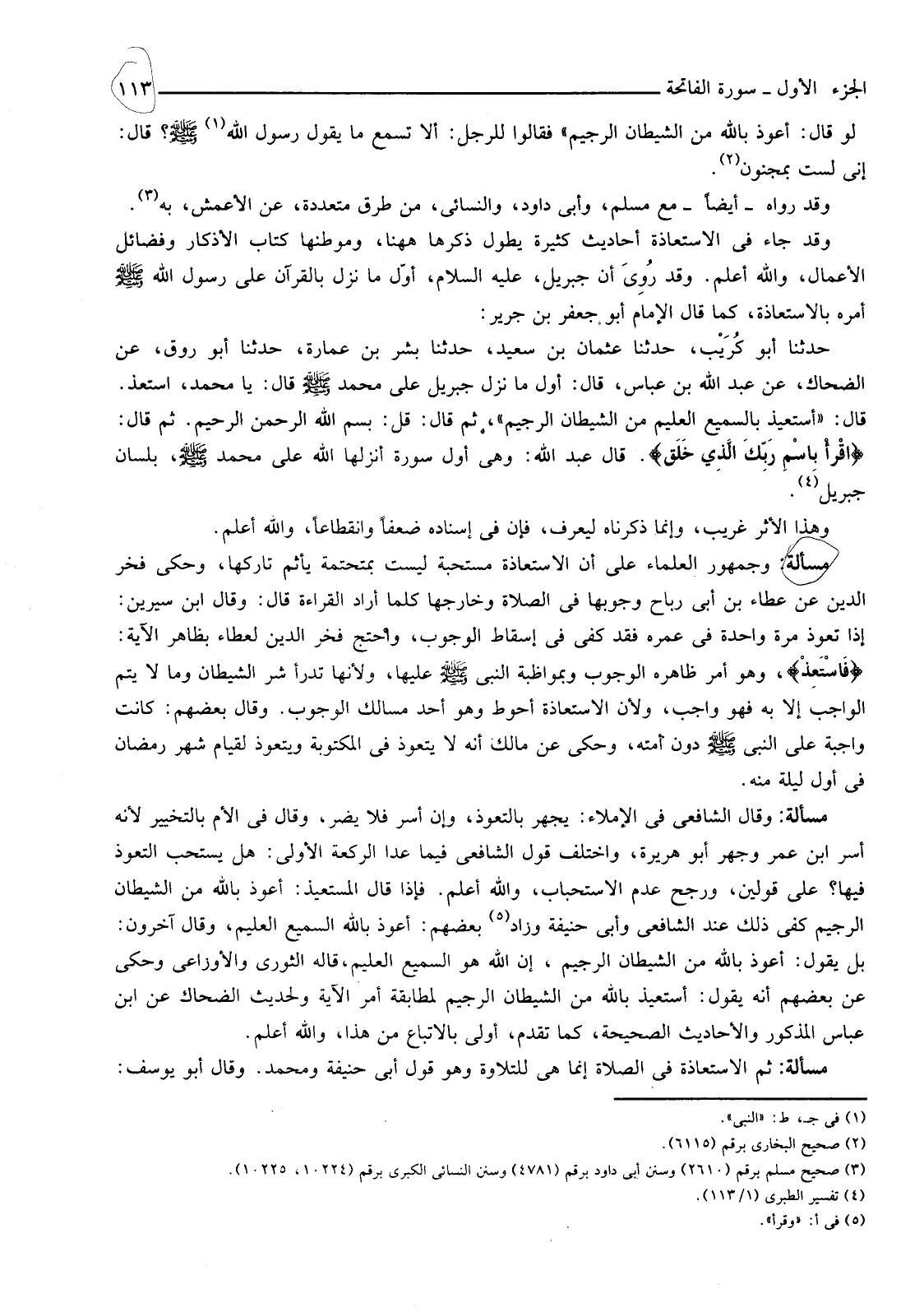 مَسْأَلَةٌ: وقال الشافعي في الإملاء، يجهر بالتعوذ، وَإِنْ أَسَرَّ فَلَا يَضُرُّ، وَقَالَ فِي الْأُمِّ بِالتَّخْيِيرِ لِأَنَّهُ أَسَرَّ ابْنُ عُمَرَ وَجَهَرَ أَبُو هُرَيْرَةَ، وَاخْتَلَفَ قَوْلُ الشَّافِعِيِّ فِيمَا عَدَا الرَّكْعَةِ الْأُولَى: هَلْ يُسْتَحَبُّ التَّعَوُّذُ فِيهَا؟ عَلَى قَوْلَيْنِ، وَرَجَّحَ عَدَمَ الِاسْتِحْبَابِ، وَاللَّهُ أَعْلَمُ. فَإِذَا قَالَ الْمُسْتَعِيذُ: أَعُوذُ بِاللَّهِ مِنَ الشَّيْطَانِ الرَّجِيمِ كَفَى ذَلِكَ عِنْدَ الشَّافِعِيِّ وَأَبِي حَنِيفَةَ وَزَادَ (¬5) بَعْضُهُمْ: أَعُوذُ بِاللَّهِ السَّمِيعِ الْعَلِيمِ، وَقَالَ آخَرُونَ: بَلْ يَقُولُ: أَعُوذُ بِاللَّهِ مِنَ الشَّيْطَانِ الرَّجِيمِ إِنَّ اللَّهَ هُوَ السَّمِيعُ الْعَلِيمُ، قَالَهُ الثَّوْرِيُّ وَالْأَوْزَاعِيُّ وَحُكِيَ عَنْ بَعْضِهِمْ أَنَّهُ يَقُولُ: أَسْتَعِيذُ بِاللَّهِ مِنَ الشَّيْطَانِ الرَّجِيمِ لِمُطَابَقَةِ أَمْرِ الْآيَةِ وَلِحَدِيثِ الضَّحَّاكِ عَنِ ابْنِ عَبَّاسٍ الْمَذْكُورِ، وَالْأَحَادِيثُ الصَّحِيحَةُ، كَمَا تَقَدَّمَ، أَوْلَى بِالِاتِّبَاعِ مِنْ هَذَا، وَاللَّهُ أَعْلَمُ.