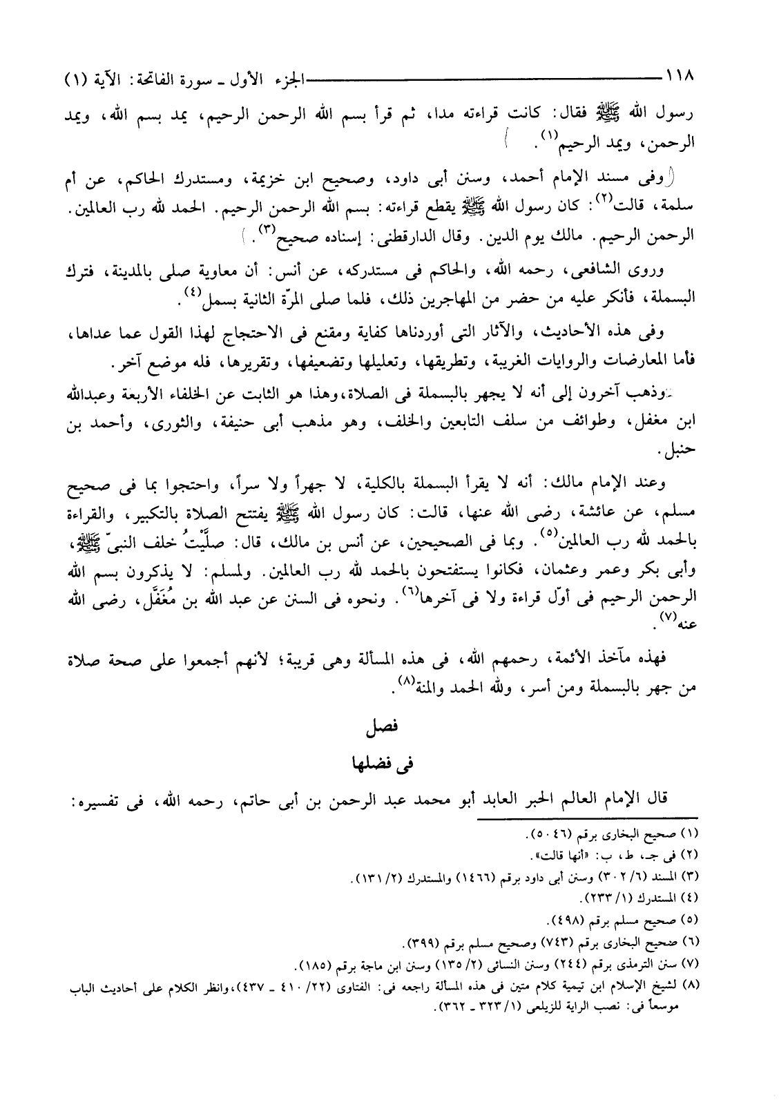 وَفِي مُسْنَدِ الْإِمَامِ أَحْمَدَ، وَسُنَنِ أَبِي دَاوُدَ، وَصَحِيحِ ابْنِ خُزَيْمَةَ، وَمُسْتَدْرَكِ الْحَاكِمِ، عَنْ أُمِّ سَلَمَةَ، قَالَتْ (¬2) : كَانَ رَسُولُ اللَّهِ صَلَّى اللَّهُ عَلَيْهِ وسلم يقطع قراءته: بِسْمِ اللَّهِ الرَّحْمَنِ الرَّحِيمِ. الْحَمْدُ لِلَّهِ رَبِّ الْعَالَمِينَ. الرَّحْمَنِ الرَّحِيمِ. مَالِكِ يَوْمِ الدِّينِ. وَقَالَ الدَّارَقُطْنِيُّ: إِسْنَادُهُ صَحِيحٌ (¬3) .