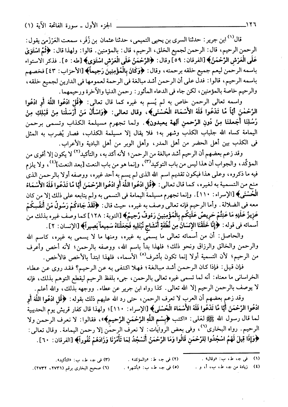 قَالَ (¬1) ابْنُ جَرِيرٍ: حَدَّثَنَا السَّرِيُّ بْنُ يَحْيَى التَّمِيمِيُّ، حَدَّثَنَا عُثْمَانُ بْنُ زُفَر، سَمِعْتُ العَرْزَميّ يَقُولُ: الرَّحْمَنُ الرَّحِيمُ، قَالَ: الرَّحْمَنُ لِجَمِيعِ الْخَلْقِ، الرَّحِيمُ، قَالَ: بِالْمُؤْمِنِينَ. قَالُوا: وَلِهَذَا قَالَ: {ثُمَّ اسْتَوَى عَلَى الْعَرْشِ الرَّحْمَنُ} [الْفُرْقَانِ: 59] وَقَالَ: {الرَّحْمَنُ عَلَى الْعَرْشِ اسْتَوَى} [طه: 5] فَذَكَرَ الِاسْتِوَاءَ بِاسْمِهِ الرَّحْمَنِ لِيَعُمَّ جَمِيعَ خَلْقِهِ بِرَحْمَتِهِ، وَقَالَ: {وَكَانَ بِالْمُؤْمِنِينَ رَحِيمًا} [الْأَحْزَابِ: 43] فَخَصَّهُمْ بِاسْمِهِ الرَّحِيمِ، قَالُوا: فَدَلَّ عَلَى أَنَّ الرَّحْمَنَ أَشَدُّ مُبَالَغَةً فِي الرَّحْمَةِ لِعُمُومِهَا فِي الدَّارَيْنِ لِجَمِيعِ خَلْقِهِ، وَالرَّحِيمُ خَاصَّةٌ بِالْمُؤْمِنِينَ، لَكِنْ جَاءَ فِي الدُّعَاءِ الْمَأْثُورِ: رَحْمَنَ الدُّنْيَا وَالْآخِرَةِ وَرَحِيمَهُمَا.