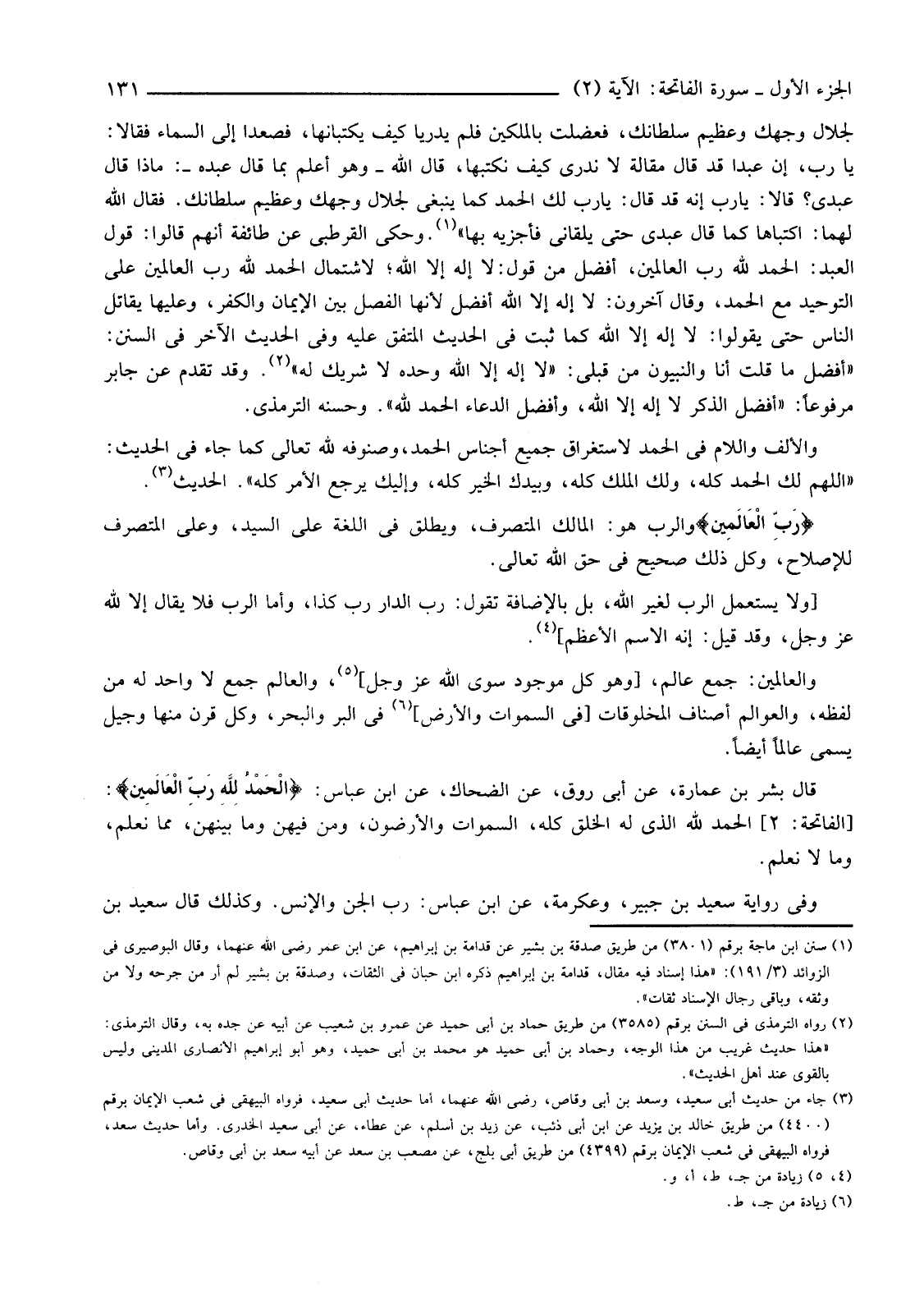 لِجَلَالِ وَجْهِكَ وَعَظِيمِ سُلْطَانِكَ، فَعَضَلَتْ بِالْمَلَكَيْنِ فَلَمْ يَدْرِيَا كَيْفَ يَكْتُبَانِهَا، فَصَعَدَا إِلَى السَّمَاءِ فَقَالَا يَا رَبِّ، إِنَّ عَبْدًا قَدْ قَالَ مَقَالَةً لَا نَدْرِي كَيْفَ نَكْتُبُهَا، قَالَ اللَّهُ -وَهُوَ أَعْلَمُ بِمَا قَالَ عَبْدُهُ-: مَاذَا قَالَ عَبْدِي؟ قَالَا يَا رَبِّ إِنَّهُ قَدْ قَالَ: يَا رَبِّ لَكَ الْحَمْدُ كَمَا يَنْبَغِي لِجَلَالِ وَجْهِكَ وَعَظِيمِ سُلْطَانِكَ. فَقَالَ اللَّهُ لَهُمَا: اكْتُبَاهَا كَمَا قَالَ عَبْدِي حَتَّى يَلْقَانِي فَأَجْزِيَهُ بِهَا" (¬1) . وَحَكَى الْقُرْطُبِيُّ عَنْ طَائِفَةٍ أَنَّهُمْ قَالُوا: قَوْلُ الْعَبْدِ: الْحَمْدُ لِلَّهِ رَبِّ الْعَالَمِينَ، أَفْضَلُ مِنْ قَوْلِ: لَا إِلَهَ إِلَّا اللَّهُ؛ لِاشْتِمَالِ الْحَمْدُ لِلَّهِ رَبِّ الْعَالَمِينَ عَلَى التَّوْحِيدِ مَعَ الْحَمْدِ، وَقَالَ آخَرُونَ: لَا إِلَهَ إِلَّا اللَّهُ أَفْضَلُ لِأَنَّهَا الْفَصْلُ بَيْنَ الْإِيمَانِ وَالْكُفْرِ، وَعَلَيْهَا يُقَاتَلُ النَّاسُ حَتَّى يَقُولُوا: لَا إِلَهَ إِلَّا اللَّهُ كَمَا ثَبَتَ فِي الْحَدِيثِ الْمُتَّفَقِ عَلَيْهِ وَفِي الْحَدِيثِ الْآخَرِ فِي السُّنَنِ: "أَفْضَلُ مَا قُلْتُ أَنَا وَالنَّبِيُّونَ مِنْ قَبْلِي: "لَا إِلَهَ إِلَّا اللَّهُ وَحْدَهُ لَا شَرِيكَ لَهُ" (¬2) . وَقَدْ تَقَدَّمَ عَنْ جَابِرٍ مَرْفُوعًا: "أَفْضَلُ الذِّكْرِ لَا إِلَهَ إِلَّا اللَّهُ، وَأَفْضَلُ الدُّعَاءِ الْحَمْدُ لِلَّهِ". وَحَسَّنَهُ التِّرْمِذِيُّ.