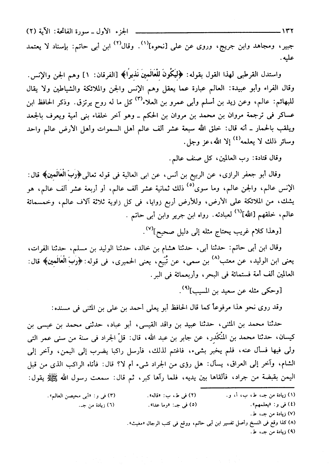 وَاسْتَدَلَّ الْقُرْطُبِيُّ لِهَذَا الْقَوْلِ بِقَوْلِهِ: {لِيَكُونَ لِلْعَالَمِينَ نَذِيرًا} [الْفُرْقَانِ: 1] وَهُمُ الْجِنُّ وَالْإِنْسُ. وَقَالَ الْفَرَّاءُ وَأَبُو عُبَيْدَةَ: الْعَالَمُ عِبَارَةٌ عَمَّا يَعْقِلُ وَهُمُ الْإِنْسُ وَالْجِنُّ وَالْمَلَائِكَةُ وَالشَّيَاطِينُ وَلَا يُقَالُ لِلْبَهَائِمِ: عَالَمٌ، وَعَنْ زَيْدِ بْنِ أَسْلَمَ وَأَبِي عَمْرِو بْنِ الْعَلَاءِ (¬3) كُلُّ مَا لَهُ رُوحٌ يَرْتَزِقُ. وَذَكَرَ الْحَافِظُ ابْنُ عَسَاكِرَ فِي تَرْجَمَةِ مَرْوَانَ بْنِ مُحَمَّدِ بْنِ مَرْوَانَ بْنِ الْحَكَمِ -وَهُوَ آخِرُ خُلَفَاءِ بَنِي أُمَيَّةَ وَيُعْرَفُ بِالْجَعْدِ وَيُلَقَّبُ بِالْحِمَارِ -أَنَّهُ قَالَ: خَلَقَ اللَّهُ سَبْعَةَ عَشَرَ أَلْفَ عَالَمٍ أَهْلُ السَّمَاوَاتِ وَأَهْلُ الْأَرْضِ عَالَمٌ وَاحِدٌ وَسَائِرُ ذَلِكَ لَا يَعْلَمُهُ (¬4) إِلَّا اللَّهُ، عَزَّ وَجَلَّ.