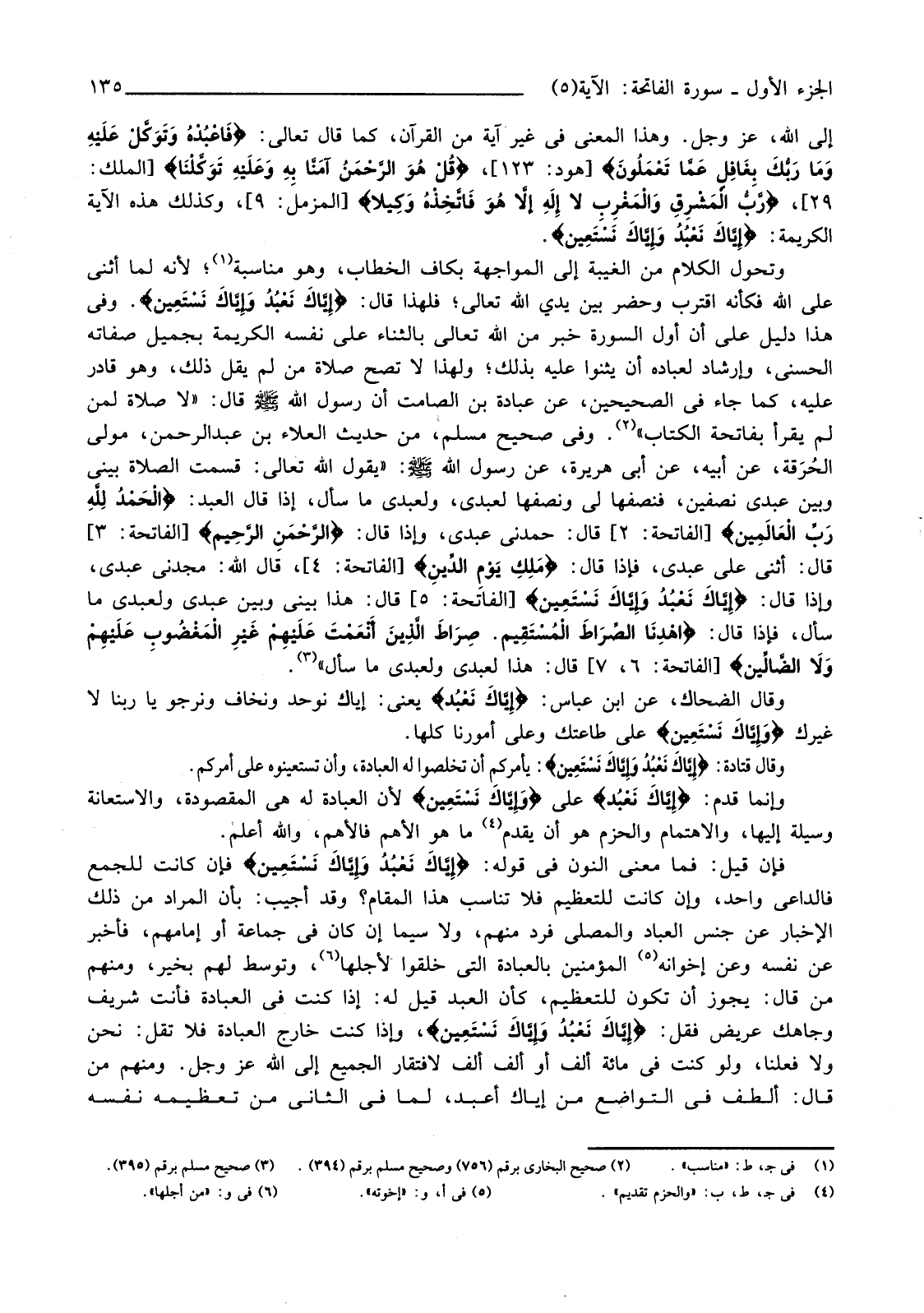 وَتَحَوُّلُ الْكَلَامِ مِنَ الْغَيْبَةِ إِلَى الْمُوَاجَهَةِ بِكَافِ الْخِطَابِ، وَهُوَ مُنَاسَبَةٌ (¬1) ، لِأَنَّهُ لَمَّا أَثْنَى عَلَى اللَّهِ فَكَأَنَّهُ اقْتَرَبَ وَحَضَرَ بَيْنَ يَدَيِ اللَّهِ تَعَالَى؛ فَلِهَذَا قَالَ: {إِيَّاكَ نَعْبُدُ وَإِيَّاكَ نَسْتَعِينُ} وَفِي هَذَا دَلِيلٌ عَلَى أَنَّ أَوَّلَ السُّورَةِ خَبَرٌ مِنَ اللَّهِ تَعَالَى بِالثَّنَاءِ عَلَى نَفْسِهِ الْكَرِيمَةِ بِجَمِيلِ صِفَاتِهِ الْحُسْنَى، وَإِرْشَادٌ لِعِبَادِهِ بِأَنْ يُثْنُوا عَلَيْهِ بِذَلِكَ؛ وَلِهَذَا لَا تَصِحُّ صَلَاةُ مَنْ لَمْ يَقُلْ ذَلِكَ، وَهُوَ قَادِرٌ عَلَيْهِ، كَمَا جَاءَ فِي الصَّحِيحَيْنِ، عَنْ عُبَادَةَ بْنِ الصَّامِتِ أَنَّ رَسُولَ اللَّهِ صَلَّى اللَّهُ عَلَيْهِ وَسَلَّمَ قَالَ: "لَا صَلَاةَ لِمَنْ لَمْ يَقْرَأْ بِفَاتِحَةِ الْكِتَابِ" (¬2) . وَفِي صَحِيحِ مُسْلِمٍ، مِنْ حَدِيثِ الْعَلَاءِ بْنِ عَبْدِ الرَّحْمَنِ، مَوْلَى الحُرَقَة، عَنْ أَبِيهِ، عَنْ أَبِي هُرَيْرَةَ، عَنْ رَسُولِ اللَّهِ صَلَّى اللَّهُ عَلَيْهِ وَسَلَّمَ: "يَقُولُ اللَّهُ تَعَالَى: قَسَمْتُ الصَّلَاةَ بَيْنِي وَبَيْنَ عَبْدِي نِصْفَيْنِ، فَنِصْفُهَا لِي وَنِصْفُهَا لِعَبْدِي، وَلِعَبْدِي مَا سَأَلَ، إِذَا قَالَ الْعَبْدُ: {الْحَمْدُ لِلَّهِ رَبِّ الْعَالَمِينَ} [الْفَاتِحَةِ: 2] قَالَ: حَمِدَنِي عَبْدِي، وَإِذَا قَالَ: {الرَّحْمَنِ الرَّحِيمِ} [الْفَاتِحَةِ: 3] قَالَ: أَثْنَى عَلَيَّ عَبْدِي، فَإِذَا قَالَ: {مَالِكِ يَوْمِ الدِّينِ} [الْفَاتِحَةِ: 4] قَالَ اللَّهُ: مَجَّدَنِي عَبْدِي، وَإِذَا قَالَ: {إِيَّاكَ نَعْبُدُ وَإِيَّاكَ نَسْتَعِينُ} [الْفَاتِحَةِ: 5] قَالَ: هَذَا بَيْنِي وَبَيْنَ عَبْدِي وَلِعَبْدِي مَا سَأَلَ، فَإِذَا قَالَ: {اهْدِنَا الصِّرَاطَ الْمُسْتَقِيمَ * صِرَاطَ الَّذِينَ أَنْعَمْتَ عَلَيْهِمْ غَيْرِ الْمَغْضُوبِ عَلَيْهِمْ وَلا الضَّالِّينَ} [الْفَاتِحَةِ: 6، 7] قَالَ: هَذَا لِعَبْدِي وَلِعَبْدِي مَا سَأَلَ" (¬3) . وَقَالَ الضَّحَّاكُ، عَنِ ابْنِ عَبَّاسٍ: {إِيَّاكَ نَعْبُدُ} يَعْنِي: إِيَّاكَ نُوَحِّدُ وَنَخَافُ وَنَرْجُو يَا رَبَّنَا لَا غَيْرَكَ {وَإِيَّاكَ نَسْتَعِينُ} عَلَى طَاعَتِكَ وَعَلَى أُمُورِنَا كُلِّهَا.