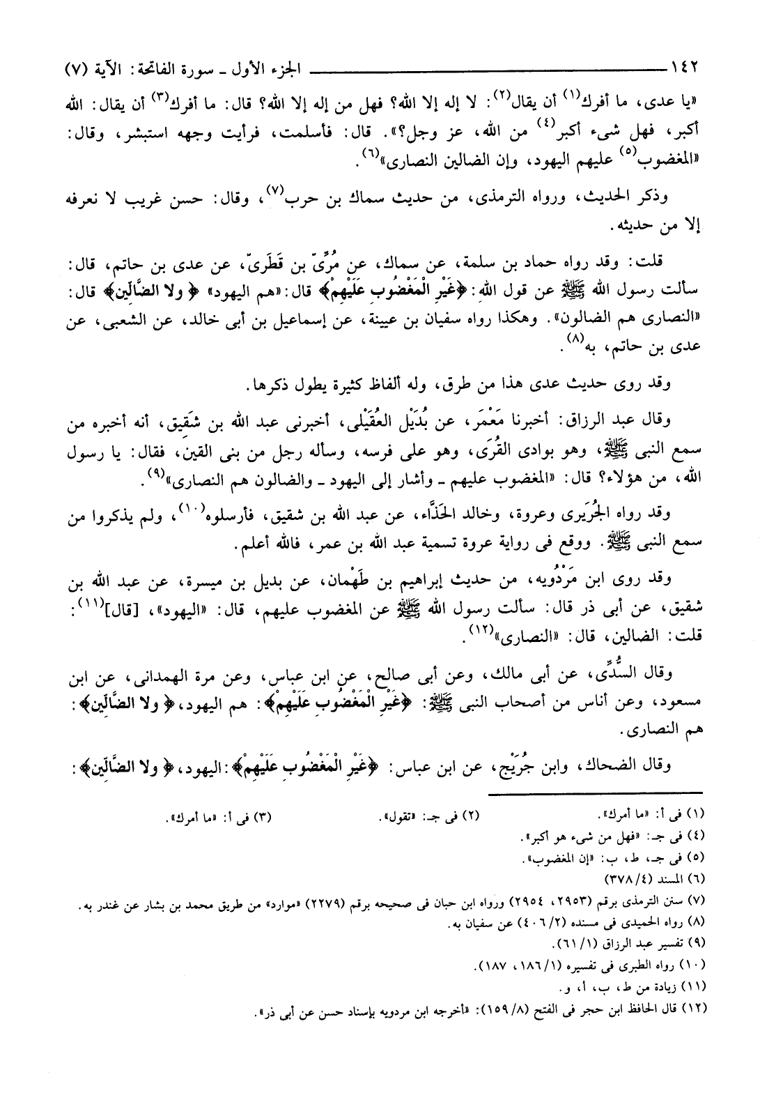 "يَا عَدِيُّ، مَا أَفَرَّكَ (¬1) أَنْ يُقَالَ (¬2) لَا إِلَهَ إِلَّا اللَّهُ؟ فَهَلْ مِنْ إِلَهٍ إِلَّا اللَّهُ؟ قَالَ: مَا أَفَرَّكَ (¬3) أَنْ يُقَالَ: اللَّهُ أَكْبَرُ، فَهَلْ شَيْءٌ أَكْبَرُ (¬4) مِنَ اللَّهِ، عَزَّ وَجَلَّ؟ ". قَالَ: فَأَسْلَمْتُ، فَرَأَيْتُ وَجْهَهُ اسْتَبْشَرَ، وَقَالَ: "الْمَغْضُوبُ (¬5) عَلَيْهِمُ الْيَهُودُ، وَإِنَّ الضَّالِّينَ النَّصَارَى" (¬6) . وَذَكَرَ الْحَدِيثَ، وَرَوَاهُ التِّرْمِذِيُّ، مِنْ حَدِيثِ سِمَاكِ بْنِ حَرْبٍ (¬7) ، وَقَالَ: حَسَنٌ غَرِيبٌ لَا نَعْرِفُهُ إِلَّا مِنْ حَدِيثِهِ. قُلْتُ: وَقَدْ رَوَاهُ حَمَّادُ بْنُ سَلَمَةَ، عَنْ سِمَاكٍ، عَنْ مُرِّيّ بْنِ قَطَريّ، عَنْ عَدِيِّ بْنِ حَاتِمٍ، قَالَ: سَأَلْتُ رَسُولَ اللَّهِ صَلَّى اللَّهُ عَلَيْهِ وَسَلَّمَ عَنْ قَوْلِ اللَّهِ: {غَيْرِ الْمَغْضُوبِ عَلَيْهِمْ} قَالَ: "هُمُ الْيَهُودُ" {وَلَا الضَّالِّينَ} قَالَ: "النَّصَارَى هُمُ الضَّالُّونَ". وَهَكَذَا رَوَاهُ سُفْيَانُ بْنُ عُيَيْنَةَ، عَنْ إِسْمَاعِيلَ بْنِ أَبِي خَالِدٍ، عَنِ الشَّعْبِيِّ، عَنْ عَدِيِّ بْنِ حَاتِمٍ بِهِ (¬8) . وَقَدْ رُوِيَ حَدِيثُ عَدِيٍّ هَذَا مِنْ طُرُقٍ، وَلَهُ أَلْفَاظٌ كَثِيرَةٌ يَطُولُ ذِكْرُهَا.