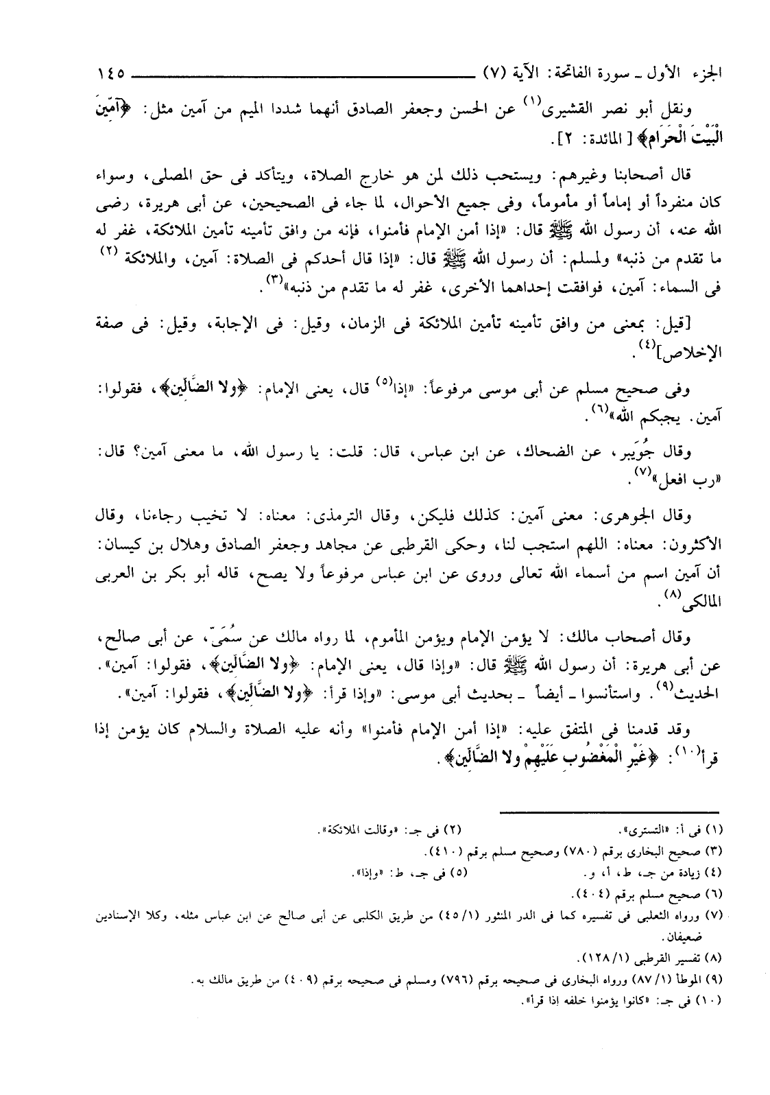 وَقَدْ قَدَّمْنَا فِي الْمُتَّفَقِ عَلَيْهِ: "إِذَا أَمَّنَ الْإِمَامُ فَأَمِّنُوا" وَأَنَّهُ عَلَيْهِ الصَّلَاةُ وَالسَّلَامُ كَانَ يُؤَمِّنُ إِذَا قَرَأَ (¬10) {غَيْرِ الْمَغْضُوبِ عَلَيْهِمْ وَلا الضَّالِّينَ}