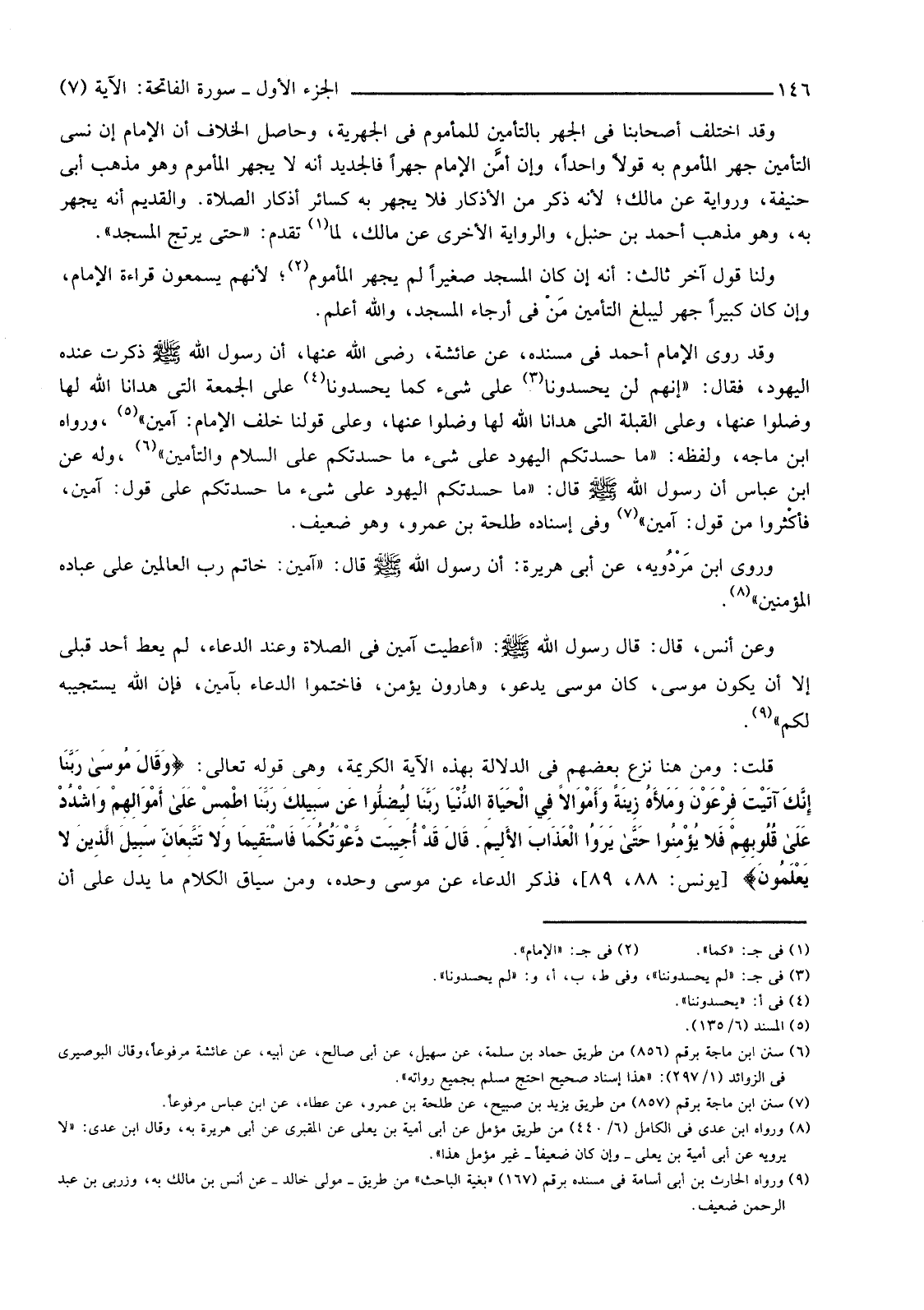 وَقَدْ رَوَى الْإِمَامُ أَحْمَدُ فِي مُسْنَدِهِ، عَنْ عَائِشَةَ، رَضِيَ اللَّهُ عَنْهَا، أَنَّ رَسُولَ اللَّهِ صَلَّى اللَّهُ عَلَيْهِ وَسَلَّمَ ذُكِرَتْ عِنْدَهُ الْيَهُودُ، فَقَالَ: "إِنَّهُمْ لَنْ يَحْسُدُونَا (¬3) عَلَى شَيْءٍ كَمَا يَحْسُدُونَا (¬4) عَلَى الْجُمُعَةِ التي هدانا الله لها وضلوا عنها، وعلى القبلة التي هدانا الله لها وضلوا عنها، وَعَلَى قَوْلِنَا خَلْفَ الْإِمَامِ: آمِينَ" (¬5) ، وَرَوَاهُ ابْنُ مَاجَهْ، وَلَفْظُهُ: "مَا حَسَدَتْكُمُ الْيَهُودُ عَلَى شَيْءٍ مَا حَسَدَتْكُمْ عَلَى السَّلَامِ وَالتَّأْمِينِ" (¬6) ، وَلَهُ عَنِ ابْنِ عَبَّاسٍ أَنَّ رَسُولَ اللَّهِ صَلَّى الله عَلَيْهِ وَسَلَّمَ قَالَ: "مَا حَسَدَتْكُمُ الْيَهُودُ عَلَى شَيْءٍ مَا حَسَدَتْكُمْ عَلَى قَوْلِ: آمِينَ، فَأَكْثِرُوا مِنْ قَوْلِ: "آمِينَ" (¬7) وَفِي إِسْنَادِهِ طَلْحَةُ بْنُ عَمْرٍو، وَهُوَ ضَعِيفٌ.