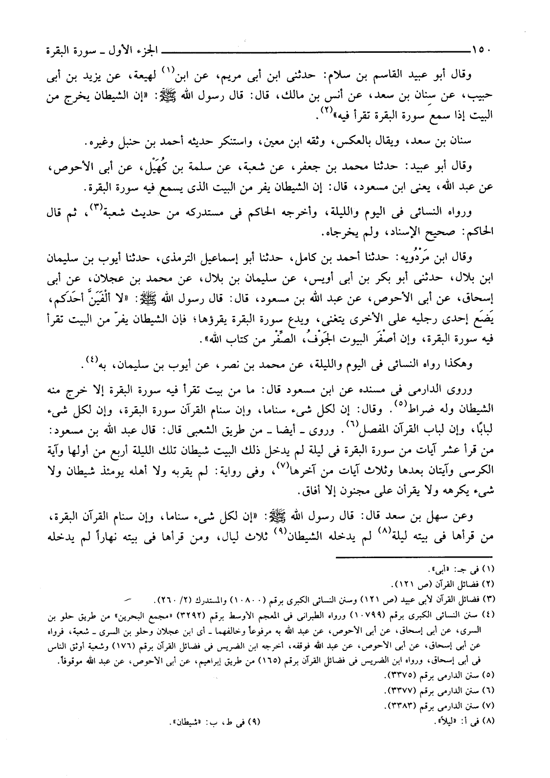 وَقَالَ أَبُو عُبَيْدٍ: حَدَّثَنَا مُحَمَّدُ بْنُ جَعْفَرٍ، عَنْ شُعْبَةَ، عَنْ سَلَمَةَ بْنِ كُهَيْل، عَنْ أَبِي الْأَحْوَصِ، عَنْ عَبْدِ اللَّهِ، يَعْنِي ابْنَ مَسْعُودٍ، قَالَ: إِنَّ الشَّيْطَانَ يَفِرُّ مِنَ الْبَيْتِ الَّذِي يُسْمَعُ فِيهِ سُورَةُ الْبَقَرَةِ. وَرَوَاهُ النَّسَائِيُّ فِي الْيَوْمِ وَاللَّيْلَةِ، وَأَخْرَجَهُ الْحَاكِمُ فِي مُسْتَدْرَكِهِ مِنْ حَدِيثِ شُعْبَةَ (3) ثُمَّ قَالَ الْحَاكِمُ: صَحِيحُ الْإِسْنَادِ، وَلَمْ يُخَرِّجَاهُ.