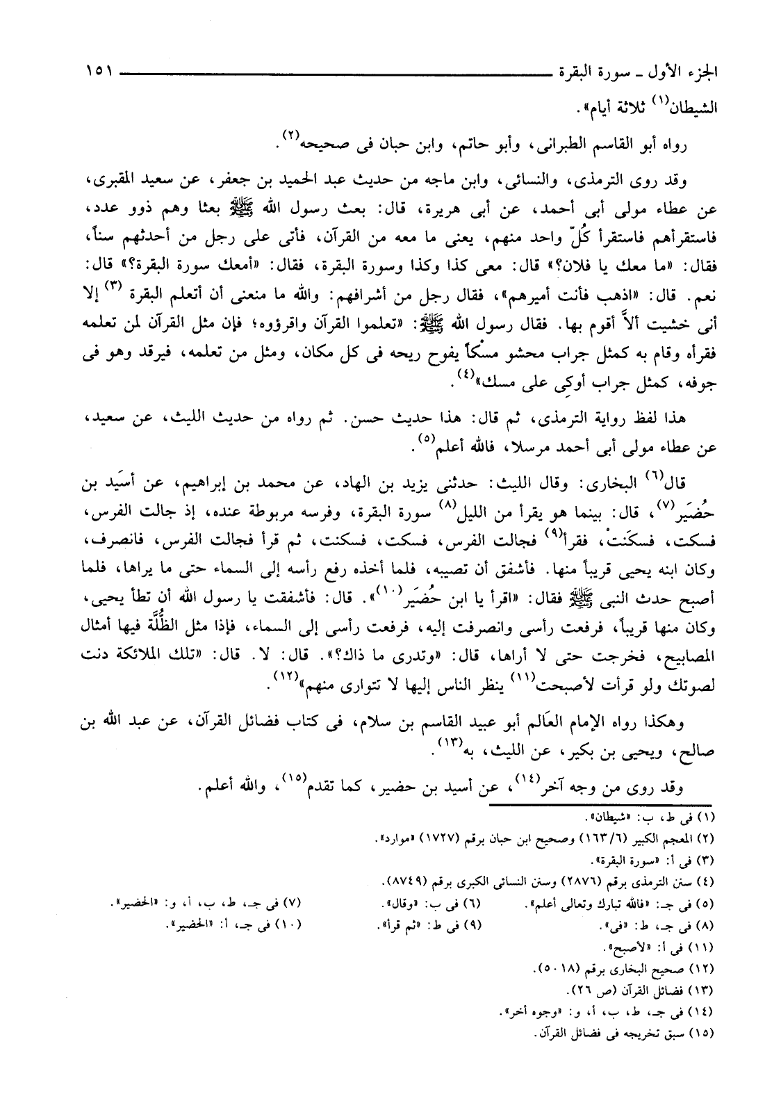 قَالَ (6) الْبُخَارِيُّ: وَقَالَ اللَّيْثُ: حَدَّثَنِي يَزِيدُ بْنُ الْهَادِ، عَنْ مُحَمَّدِ بْنِ إِبْرَاهِيمَ، عَنْ أسَيد بْنِ حُضَير (7) قَالَ: بَيْنَمَا هُوَ يَقْرَأُ مِنَ اللَّيْلِ (8) سُورَةَ الْبَقَرَةِ، وَفَرَسُهُ مَرْبُوطَةٌ عِنْدَهُ، إِذْ جَالَتِ الْفَرَسُ، فَسَكَتَ، فسكَنتْ، فَقَرَأَ (9) فَجَالَتِ الْفَرَسُ، فَسَكَتَ، فَسَكَنَتْ، ثُمَّ قَرَأَ فَجَالَتِ الْفَرَسُ، فَانْصَرَفَ، وَكَانَ ابْنُهُ يَحْيَى قَرِيبًا مِنْهَا. فَأَشْفَقَ أَنْ تُصِيبَهُ، فَلَمَّا أَخَذَهُ رَفْعَ رَأْسَهُ إِلَى السَّمَاءِ حَتَّى مَا يَرَاهَا، فَلَمَّا أَصْبَحَ حَدَّثَ النَّبِيَّ صَلَّى اللَّهُ عَلَيْهِ وَسَلَّمَ فَقَالَ: " اقْرَأْ يَا ابْنَ حُضَير (10) ". قَالَ: فَأَشْفَقْتُ يَا رَسُولَ اللَّهِ أَنْ تَطَأَ يَحْيَى، وَكَانَ مِنْهَا قَرِيبًا، فَرَفَعْتُ رَأْسِي وَانْصَرَفْتُ إِلَيْهِ، فَرَفَعْتُ رَأْسِي إِلَى السَّمَاءِ، فَإِذَا مِثْلُ الظُّلَّة فِيهَا أَمْثَالُ الْمَصَابِيحِ، فَخَرَجْتُ حَتَّى لَا أَرَاهَا، قَالَ: " وَتَدْرِي مَا ذَاكَ؟ ". قَالَ: لَا. قَالَ: " تِلْكَ الْمَلَائِكَةُ دَنَتْ لِصَوْتِكَ وَلَوْ قَرَأْتَ لَأَصْبَحَتْ (11) يَنْظُرُ النَّاسُ إِلَيْهَا لَا تَتَوَارَى مِنْهُمْ (12) .