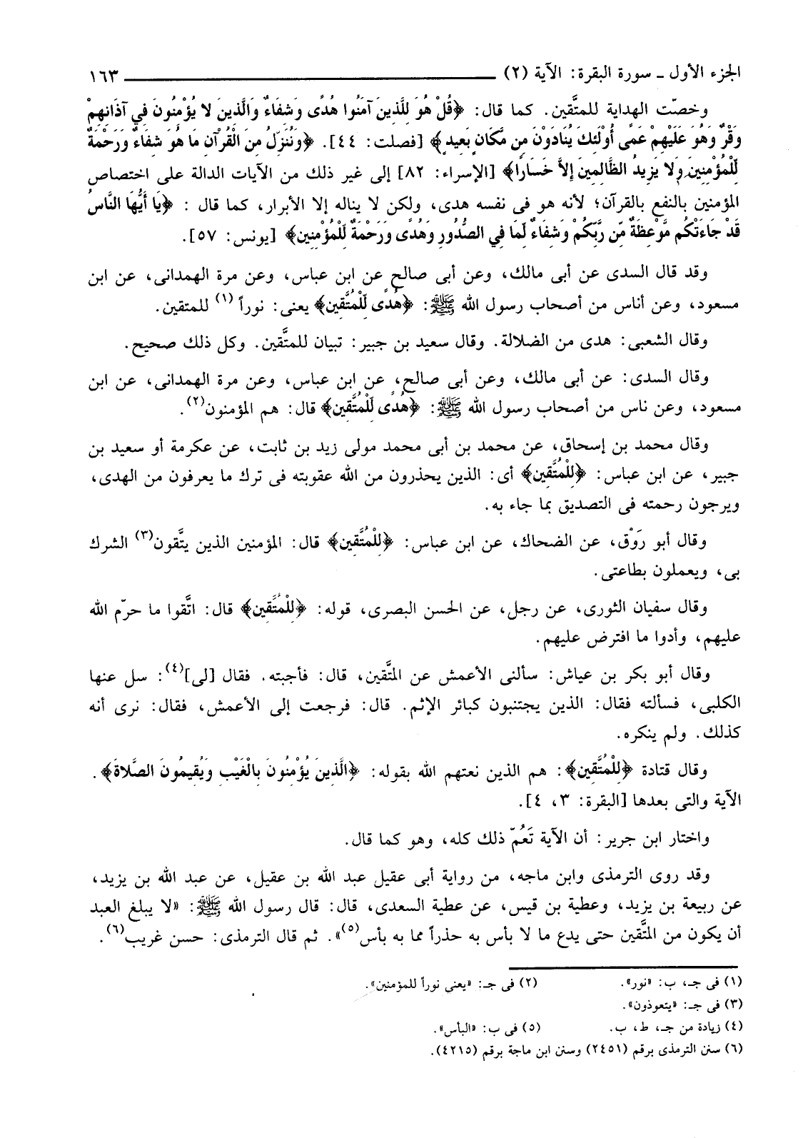 وَقَالَ الشَّعْبِيُّ: هُدًى مِنَ الضَّلَالَةِ. وَقَالَ سَعِيدُ بْنُ جُبَيْرٍ: تِبْيَانٌ للمتَّقين. وَكُلُّ ذَلِكَ صَحِيحٌ.