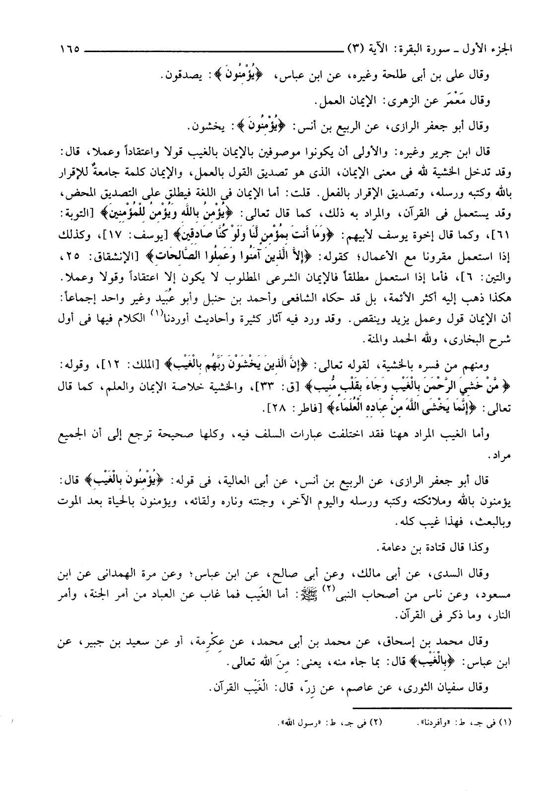 قَالَ ابْنُ جَرِيرٍ وَغَيْرُهُ: وَالْأَوْلَى أَنْ يَكُونُوا مَوْصُوفِينَ بِالْإِيمَانِ بِالْغَيْبِ قَوْلًا وَاعْتِقَادًا وَعَمَلًا قَالَ: وَقَدْ تَدْخُلُ الْخَشْيَةُ لِلَّهِ فِي مَعْنَى الْإِيمَانِ، الَّذِي هُوَ تَصْدِيقُ الْقَوْلِ بِالْعَمَلِ، وَالْإِيمَانُ كَلِمَةٌ جامعةٌ لِلْإِقْرَارِ بِاللَّهِ وَكُتُبِهِ وَرُسُلِهِ، وَتَصْدِيقُ الْإِقْرَارِ بِالْفِعْلِ. قُلْتُ: أَمَّا الْإِيمَانُ فِي اللُّغَةِ فَيُطْلَقُ عَلَى التَّصْدِيقِ الْمَحْضِ، وَقَدْ يُسْتَعْمَلُ فِي الْقُرْآنِ، وَالْمُرَادُ بِهِ ذَلِكَ، كَمَا قَالَ تَعَالَى: {يُؤْمِنُ بِاللَّهِ وَيُؤْمِنُ لِلْمُؤْمِنِينَ} [التَّوْبَةِ: 61] ، وَكَمَا قَالَ إِخْوَةُ يُوسُفَ لِأَبِيهِمْ: {وَمَا أَنْتَ بِمُؤْمِنٍ لَنَا وَلَوْ كُنَّا صَادِقِينَ} [يُوسُفَ: 17] ، وَكَذَلِكَ إِذَا اسْتُعْمِلَ مَقْرُونًا مَعَ الْأَعْمَالِ؛ كَقَوْلِهِ: {إِلا الَّذِينَ آمَنُوا وَعَمِلُوا الصَّالِحَاتِ} [الِانْشِقَاقِ: 25، وَالتِّينِ: 6] ، فَأَمَّا إِذَا اسْتُعْمِلَ مُطْلَقًا فَالْإِيمَانُ الشَّرْعِيُّ الْمَطْلُوبُ لَا يَكُونُ إِلَّا اعْتِقَادًا وَقَوْلًا وَعَمَلًا.