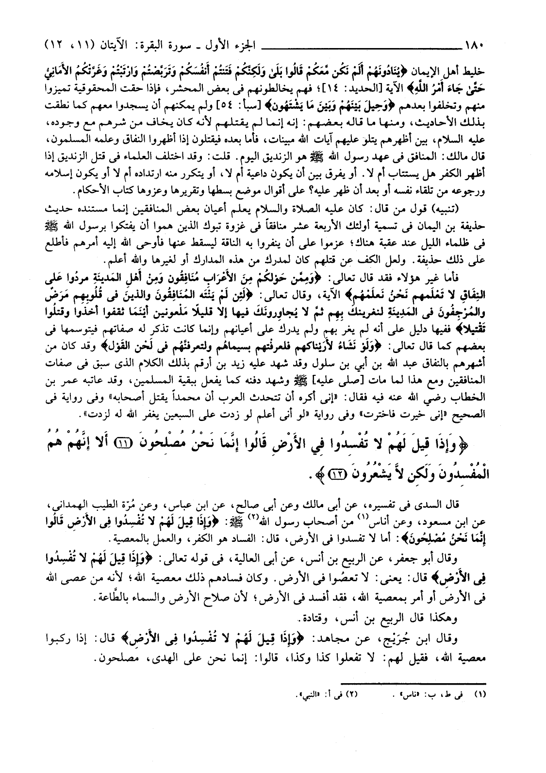 قَالَ السُّدِّيُّ فِي تَفْسِيرِهِ، عَنْ أَبِي مَالِكٍ وَعَنْ أَبِي صَالِحٍ، عَنِ ابْنِ عَبَّاسٍ، وَعَنْ مُرّة الطَّيِّبِ الْهَمْدَانِيُّ، عَنِ ابْنِ مَسْعُودٍ، وَعَنْ أُنَاسٍ (1) مِنْ أَصْحَابِ رَسُولِ اللَّهِ (2) صَلَّى اللَّهُ عَلَيْهِ وَسَلَّمَ: {وَإِذَا قِيلَ لَهُمْ لَا تُفْسِدُوا فِي الأرْضِ قَالُوا إِنَّمَا نَحْنُ مُصْلِحُونَ} أَمَّا لَا تُفْسِدُوا فِي الْأَرْضِ، قَالَ: الْفَسَادُ هُوَ الْكُفْرُ، وَالْعَمَلُ بِالْمَعْصِيَةِ.